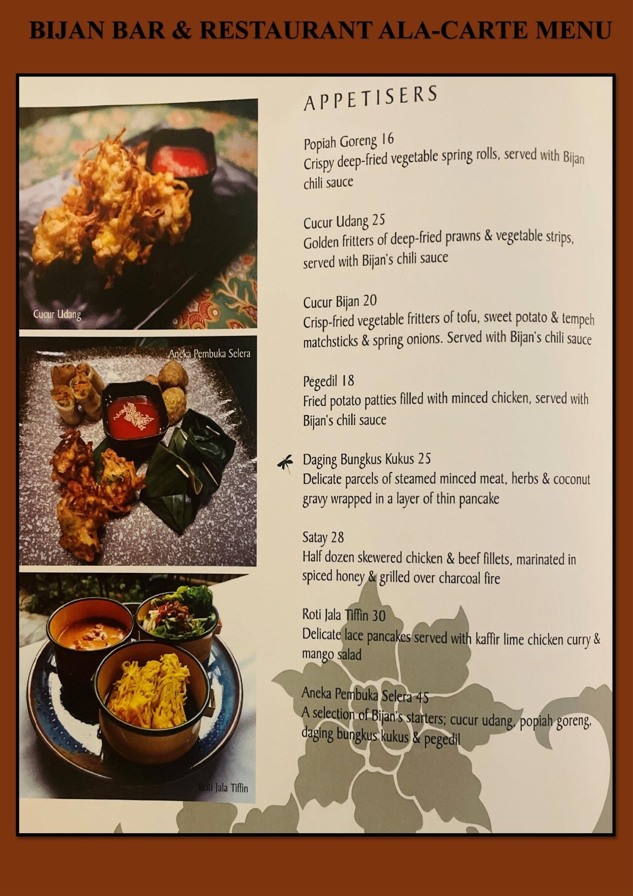 Bijan (bee-jahn) n. 1. Malay for sesame 2. a modern restaurant that specialises in fine Malay cuisine. Bijan opened its doors in September 2003 to offer a unique dining experience to discerning palates. The Bijan experience is modern in presentation yet wholesome in flavour. Traditional Malay cuisine is taken out of hawker stalls and buffet lines, and served against a lush backdrop. Modern in its surroundings with distinctive Asian accents, Bijan is warm, yet chic; intimate yet spacious. At Bijan restaurant, we are innovating ways of enjoying Malay food, introducing accompanying wine to enhance flavours and ways of preparing local delicacies in a fine balance of old and new. Our dishes are a mix of recipes handed down over the generations and innovations of the real thing, to produce forgotten favourites and delicious new flavours and textures.Located a mere stone throw’s away from KLCC and Bukit Bintang, Bijan is the ultimate destination for fine Malay cuisine. It is an oasis where you can unwind with a cool glass of wine while the food remains deliciously and unmistakably Malay. Enjoy pre-dinner drinks on the terrace while sampling our delicate canapés. Bijan restaurant won Best Malay Restaurant in 2004, just a year after we opened. We can also be found in Malaysia Tatler’s Top 100 Restaurants, The Lonely Planet Guide to Malaysia, The Miele Guide to just name a few.