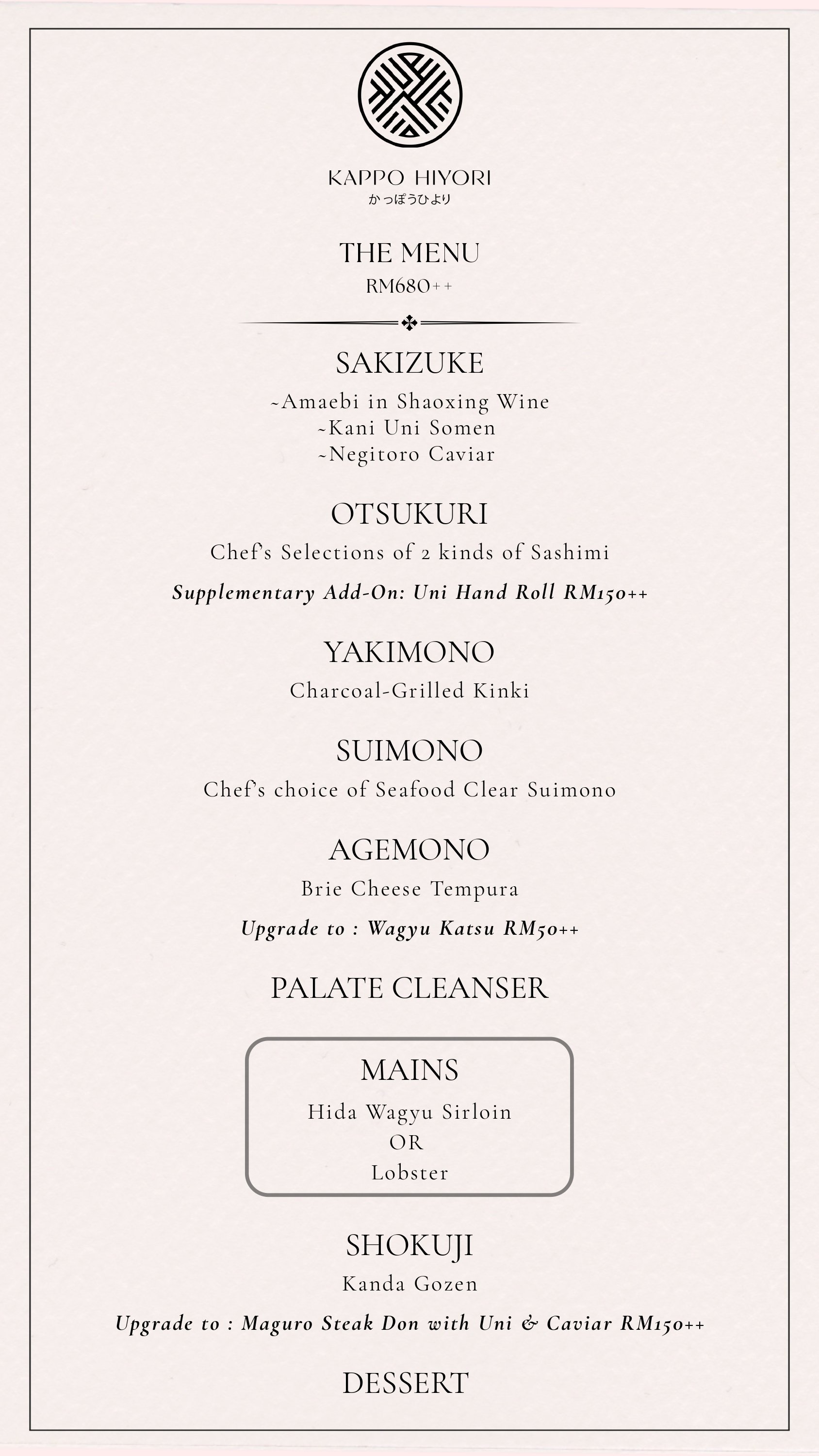 "Hiyori means the perfect day. At Kappo Hiyori, every meal is created to feel like that—an occasion shaped by the season, the ingredients, and the encounter. At Kappo Hiyori, I hope each guest feels that they are not only dining, but living a perfect day—one that cannot be repeated, yet will be remembered. This is kappo for me: to cook, to share, and to treasure the moment together." A once-in-a-lifetime day, shared through kappo.