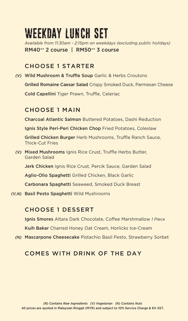 Ignis is a bar and grill restaurant with an open kitchen that revolves around a woodfire grill. Taking inspiration from the Latin word Ignis that signifies the brightness of fire, the flames of our grills are masterfully manipulated to spread that fiery heat to flavour our food. We are also passionate supporters of sustainable farming practices hence our menu is a farm-to-table concept with dishes that celebrate locally sourced ingredients from Malaysian farms. Our cuisine is a fusion fest of modern European and Asian inspired ingredients. Almost everything on our menu gets a hearty lick of our flames over our woodfire and charcoal grills here. You’ll be sampling from the freshest and tastiest produce sourced locally from our Malaysian fa rms. We also have an extensive beverage list at our bar for an unforgettable food-pairing experience.