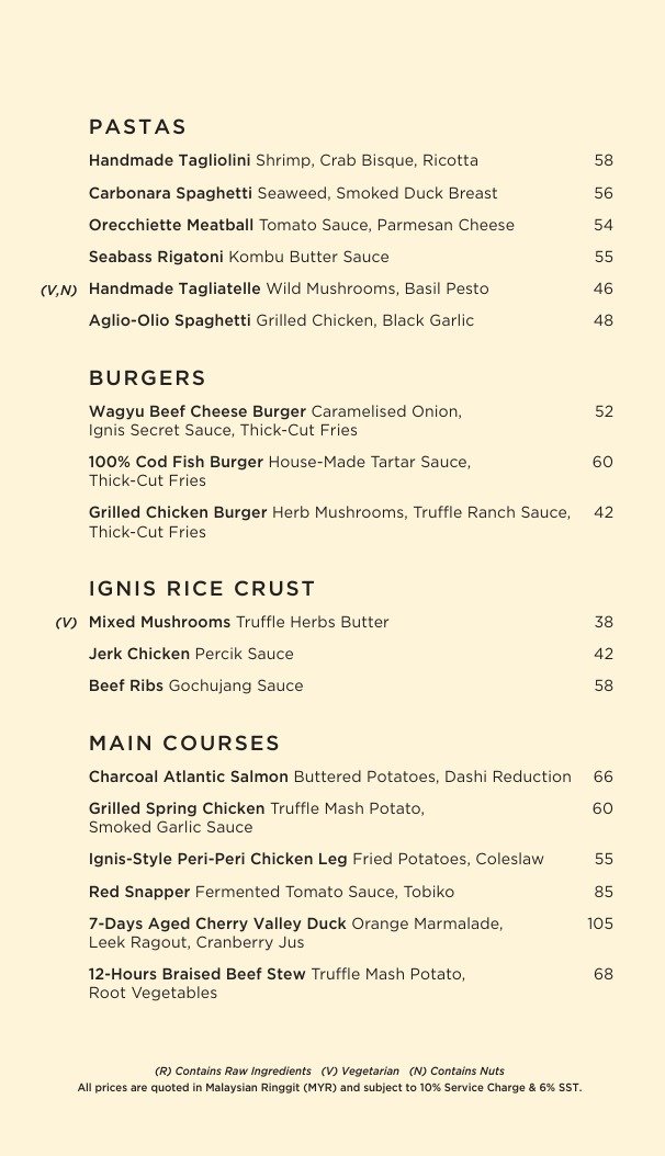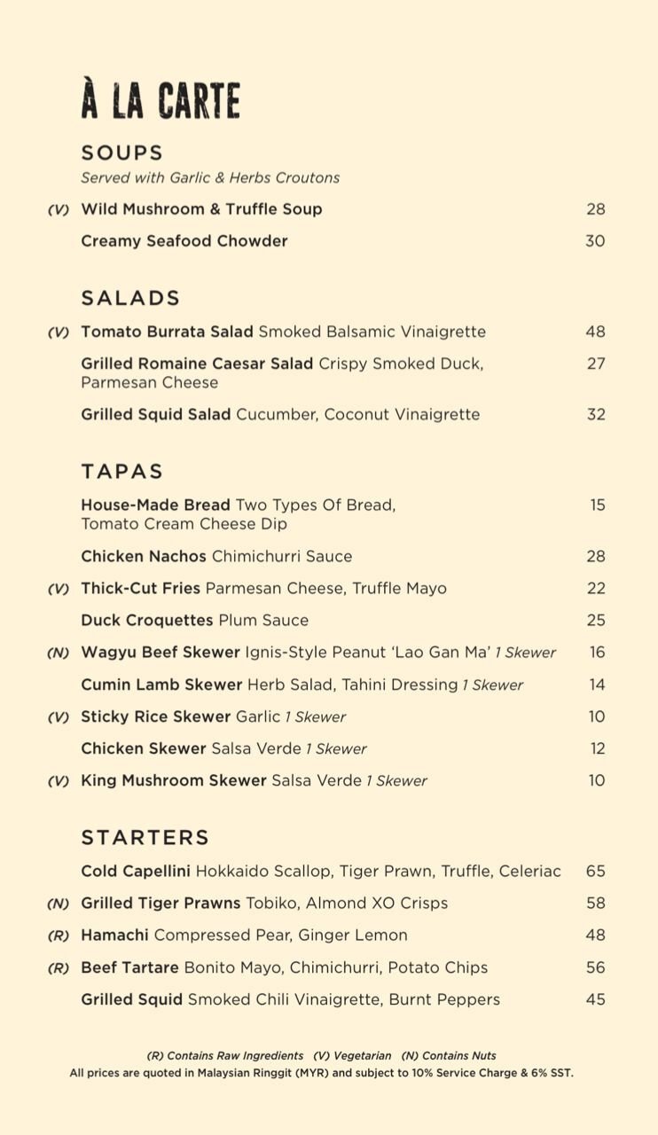 Ignis is a bar and grill restaurant with an open kitchen that revolves around a woodfire grill. Taking inspiration from the Latin word Ignis that signifies the brightness of fire, the flames of our grills are masterfully manipulated to spread that fiery heat to flavour our food. We are also passionate supporters of sustainable farming practices hence our menu is a farm-to-table concept with dishes that celebrate locally sourced ingredients from Malaysian farms. Our cuisine is a fusion fest of modern European and Asian inspired ingredients. Almost everything on our menu gets a hearty lick of our flames over our woodfire and charcoal grills here. You’ll be sampling from the freshest and tastiest produce sourced locally from our Malaysian fa rms. We also have an extensive beverage list at our bar for an unforgettable food-pairing experience.
