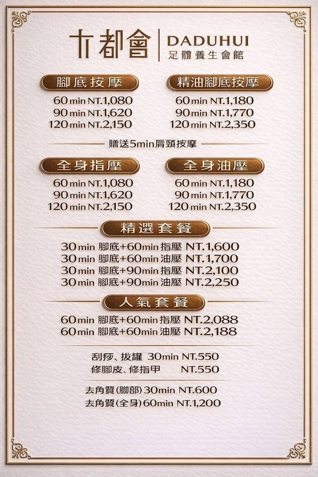 全身按摩C 120分鐘,若升級油壓每小時加一百