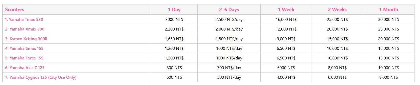 If you have any questions about rental pricing, please visit our website at taipeiscooterrentals.com or contact us on WhatsApp at +886908289299