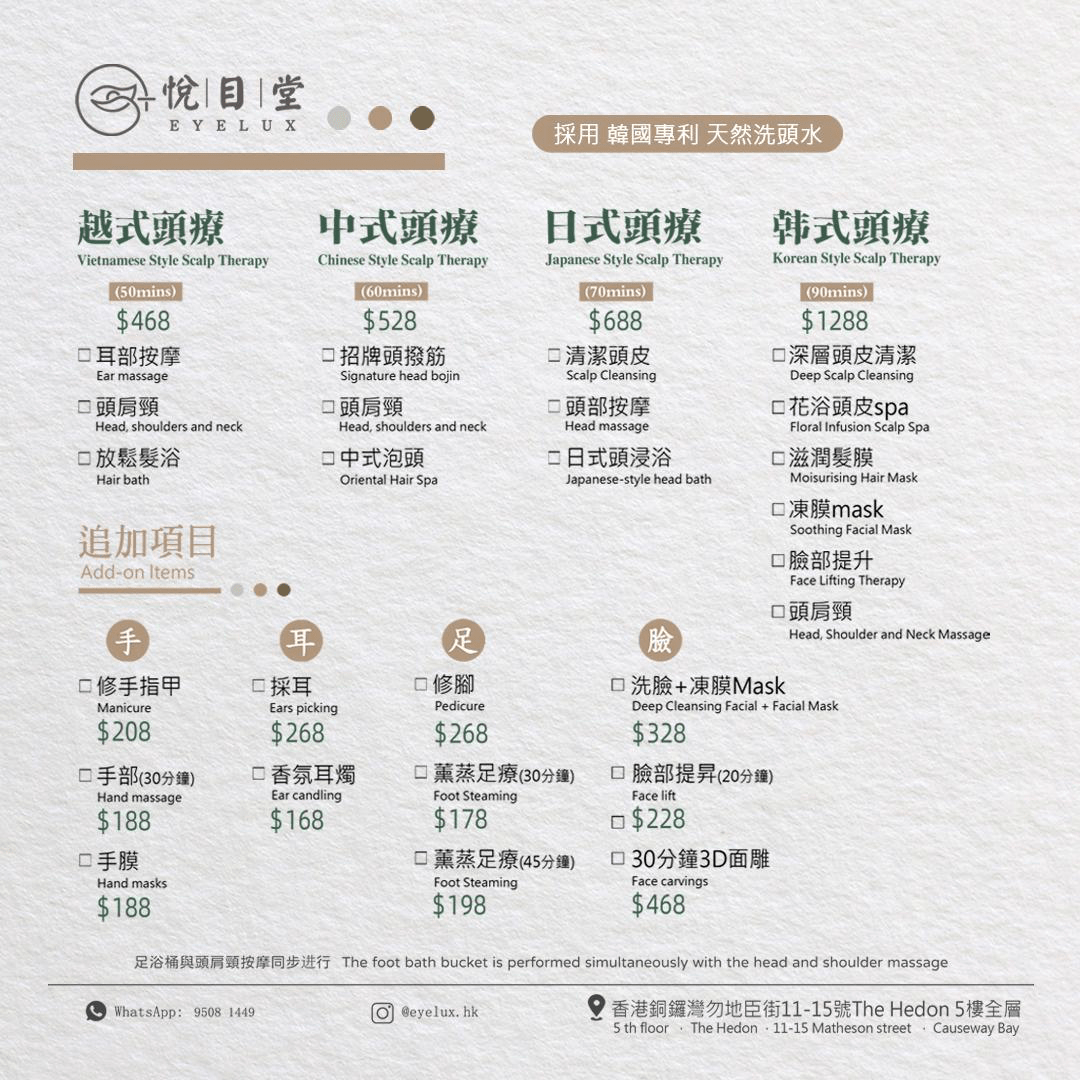 悅目堂係唯一香港推出獨家眼療體驗,按摩店以天然草本配方和按摩手法,有助於延緩眼部老化、乾眼症等疾病。草本護眼精華經由霧化、艾灸、按摩等專業眼部護理程式,為眼睛補充營養,修復眼部疲勞,讓眼睛煥發光彩,為面部注入神采。