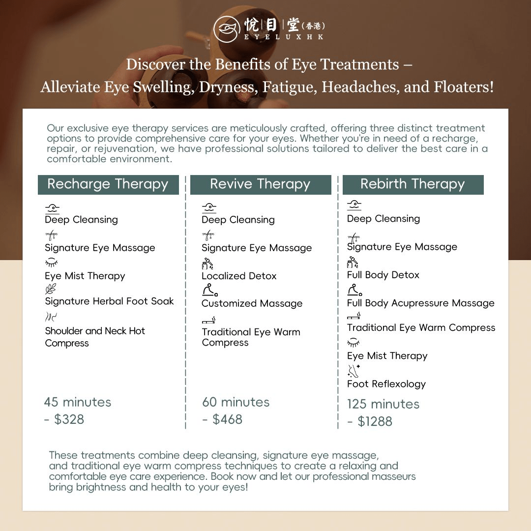 悅目堂係唯一香港推出獨家眼療體驗,按摩店以天然草本配方和按摩手法,有助於延緩眼部老化、乾眼症等疾病。草本護眼精華經由霧化、艾灸、按摩等專業眼部護理程式,為眼睛補充營養,修復眼部疲勞,讓眼睛煥發光彩,為面部注入神采。