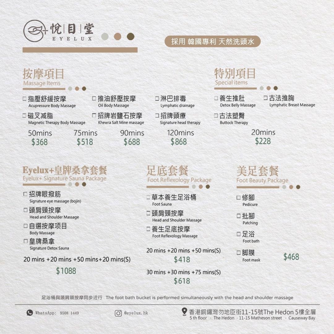 悅目堂係唯一香港推出獨家眼療體驗,按摩店以天然草本配方和按摩手法,有助於延緩眼部老化、乾眼症等疾病。草本護眼精華經由霧化、艾灸、按摩等專業眼部護理程式,為眼睛補充營養,修復眼部疲勞,讓眼睛煥發光彩,為面部注入神采。
