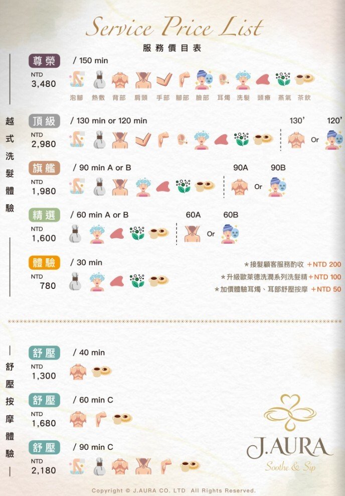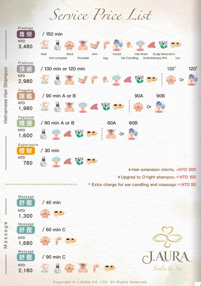 J.AURA Ximen Vietnamese Shampoo Spa is a highly-rated shampoo massage shop located in the Zhongzheng District of Taipei City. In the trendiest cultural area of Taipei, Ximen, J.AURA Ximen Vietnamese Shampoo Spa creates a relaxing sanctuary that combines Vietnamese and modern aesthetics. We focus on the ultimate art of Vietnamese shampooing, paired with the deep healing of a top-tier spa, providing you with the highest level of immersive massage enjoyment. Every guest who walks into our shop can completely relieve their physical and mental fatigue. Combining aromatherapy and energy acupressure, we offer a variety of treatments including neck and shoulder relaxation, head essential oil care, ear candle therapy, and facial soothing. Carefully selected natural plant-based essential oils and fragrances create a tranquil atmosphere, making each treatment not just a shampoo, but a journey to regain balance of body and mind.