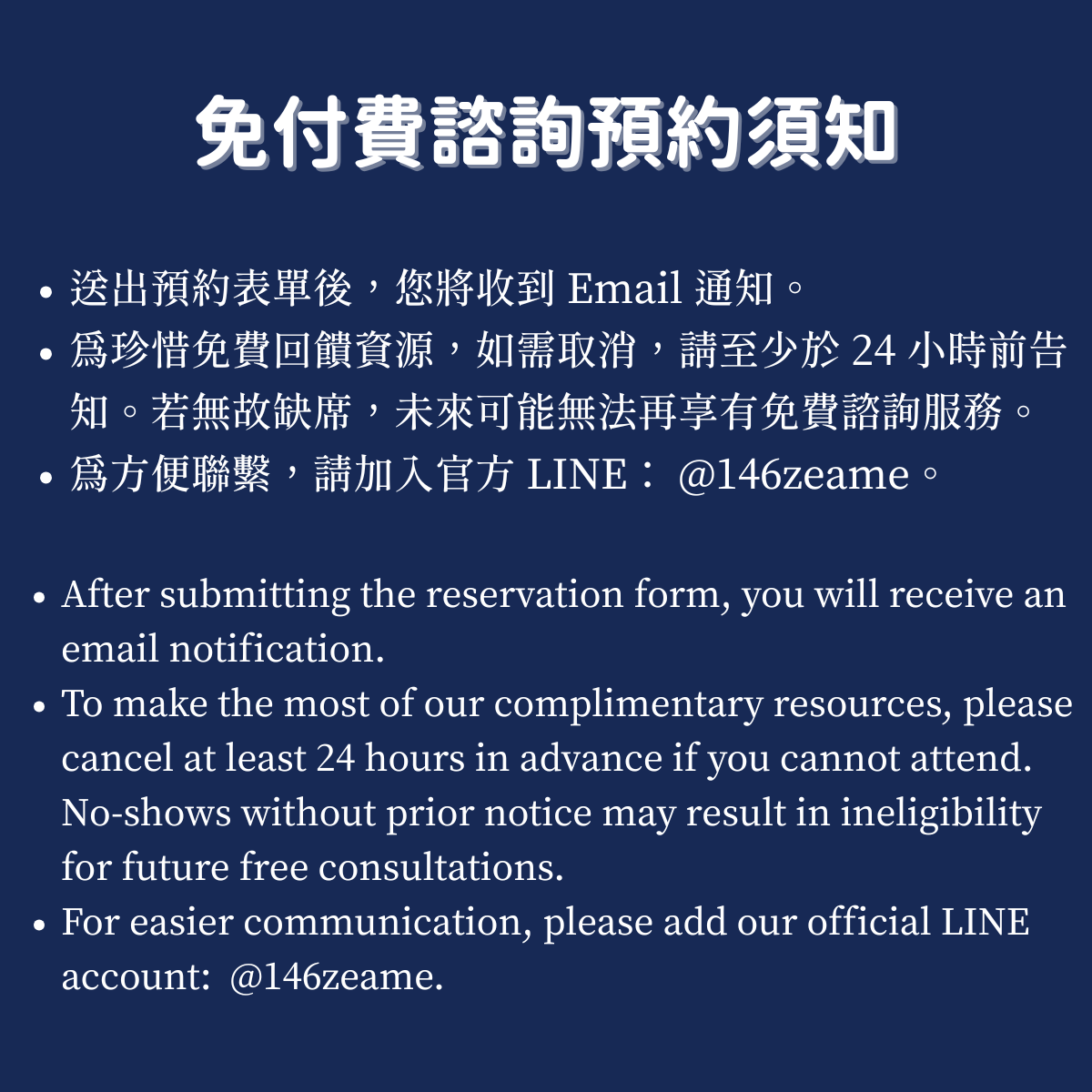 為珍惜免費回饋資源,如需取消,請至少於 24 小時前告知。若無故缺席,未來可能無法再享有免費諮詢服務。為方便聯繫,請先加入官方 LINE:@146zeame