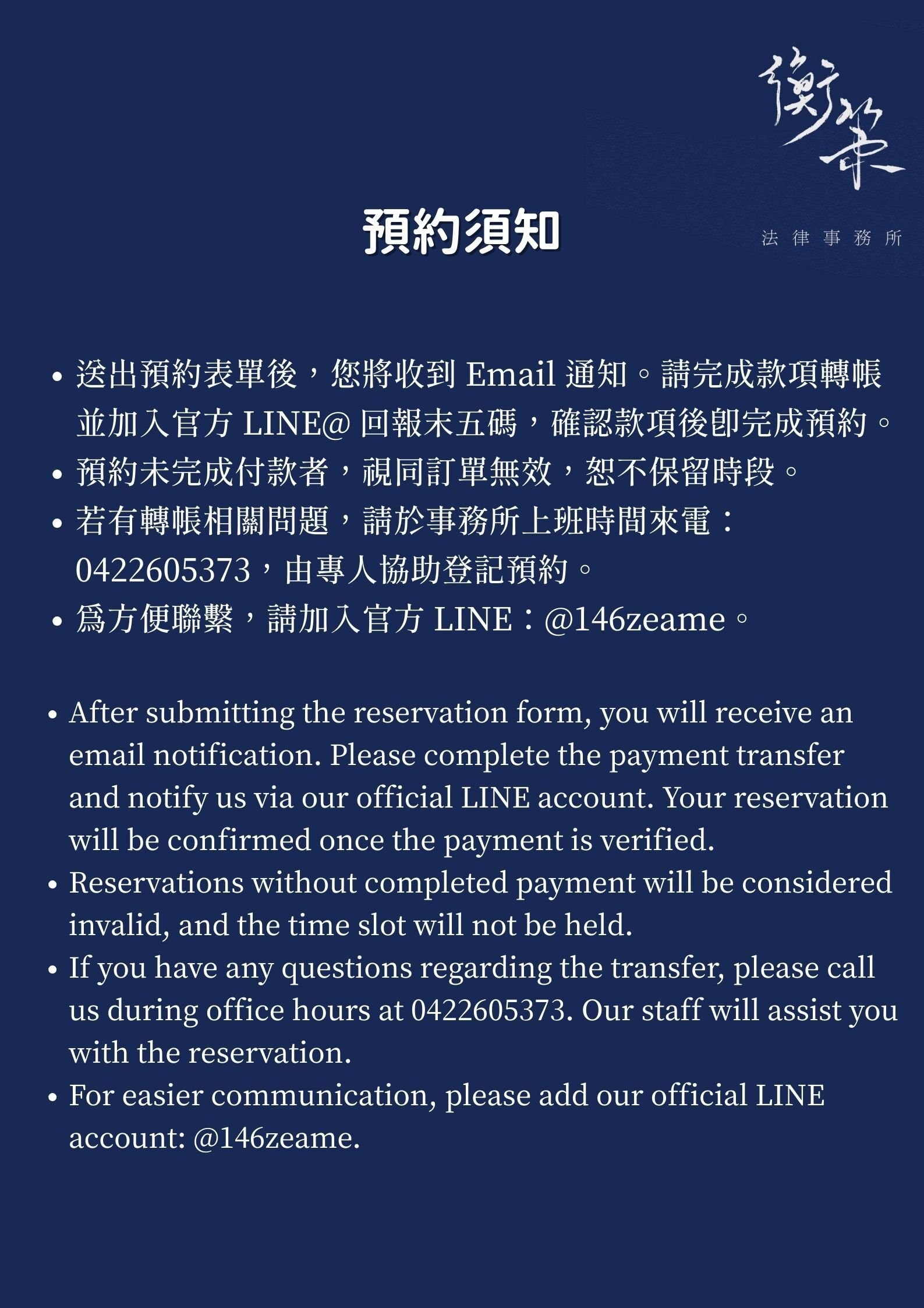 預約將為您保留 10 分鐘,若有延誤請提前來電 04-22605373,本所保有調整或取消權利。