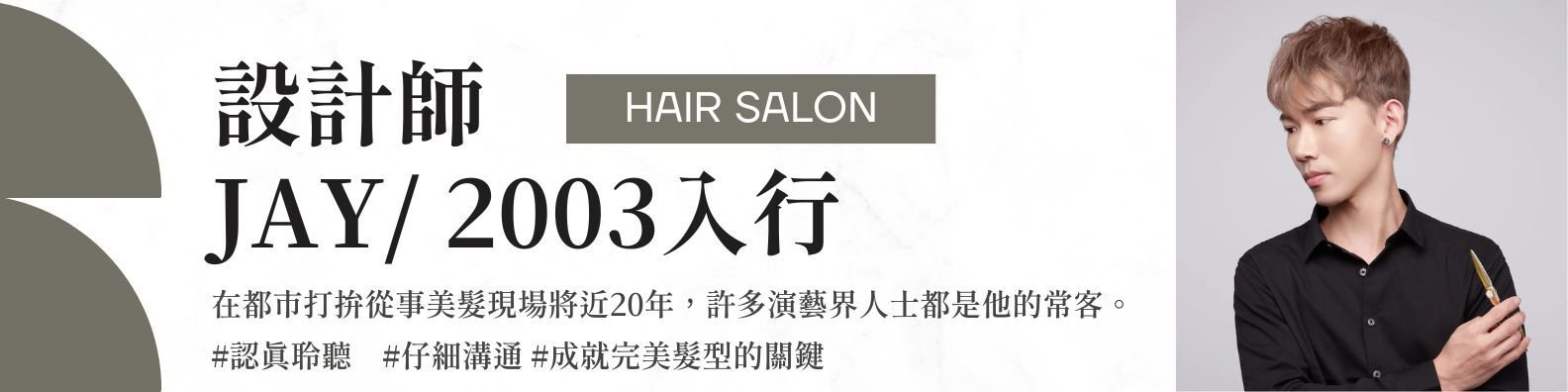 型正苑 Hair Salon|台中東區專業美髮 在 型正苑 Hair Salon,每一款髮型都經過量身設計。我們仔細觀察你的 頭型、臉型、髮色與膚質,並結合 職業、年齡、穿搭風格與季節,精準規劃最適合你的造型。 設計師|Jay 2003 年入行,累積近 20 年都市美髮經驗,服務過多位演藝圈人士。擅長 男士髮型架構設計、剪髮、染燙與頭皮護理,以 細膩手法與真誠溝通,打造每位顧客專屬風格。 真誠、專注、堅持,讓每位顧客都能擁有獨一無二的美麗髮型。