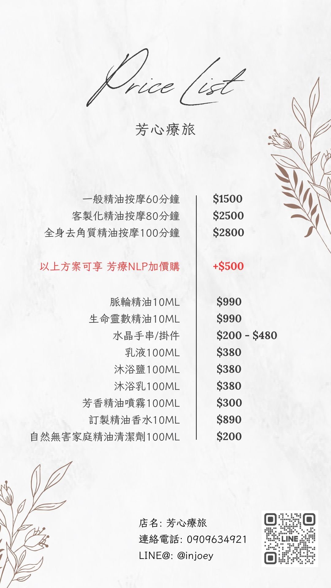 拖著疲憊來,輕盈離開。 天然精油 × 按摩 × NLP療癒 專屬調香,寵物友善,預約你的芳香旅程🌿 1. 芳心療旅|每一次放鬆,都是找回自己的旅程。 2. 香氣療癒身心,雙手釋放壓力。你值得這份溫柔。 3. 天然・手作・寵物友善|芳香的力量,從你開始。 4. 不只是芳療,更是身與心的重啟之地。
