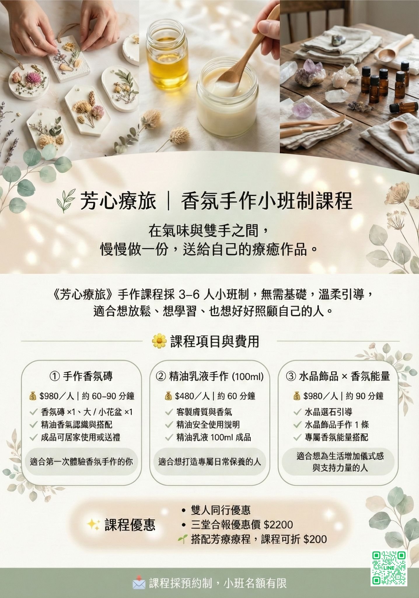 拖著疲憊來,輕盈離開。 天然精油 × 按摩 × NLP療癒 專屬調香,寵物友善,預約你的芳香旅程🌿 1. 芳心療旅|每一次放鬆,都是找回自己的旅程。 2. 香氣療癒身心,雙手釋放壓力。你值得這份溫柔。 3. 天然・手作・寵物友善|芳香的力量,從你開始。 4. 不只是芳療,更是身與心的重啟之地。