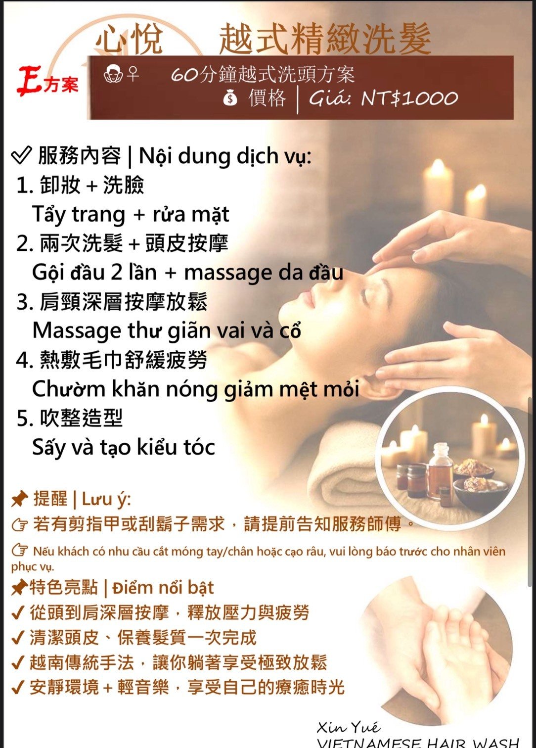 心悅越式精緻洗髮是桃園區高評價的越式洗髮。您專屬的一站式療癒綠洲,秉持著「把每位客人都當作是親友照顧」的精神,我們傳遞的不僅是技術,更是充滿溫度的身心放鬆。由專業越南籍技師操刀,搭配精選草本洗護產品,帶您體驗最正宗的越式 Spa。有別於傳統洗髮,我們結合了溫和潔面、頭皮深層淨化、專業掏耳及肩頸精油舒壓,提供全方位的細緻呵護。在靜謐舒適的氛圍中,每個細節都為您精心設計。走進心悅,為您洗去都市喧囂與工作重擔,讓您徹底卸下壓力,帶著輕盈的步伐與微笑滿意而歸。