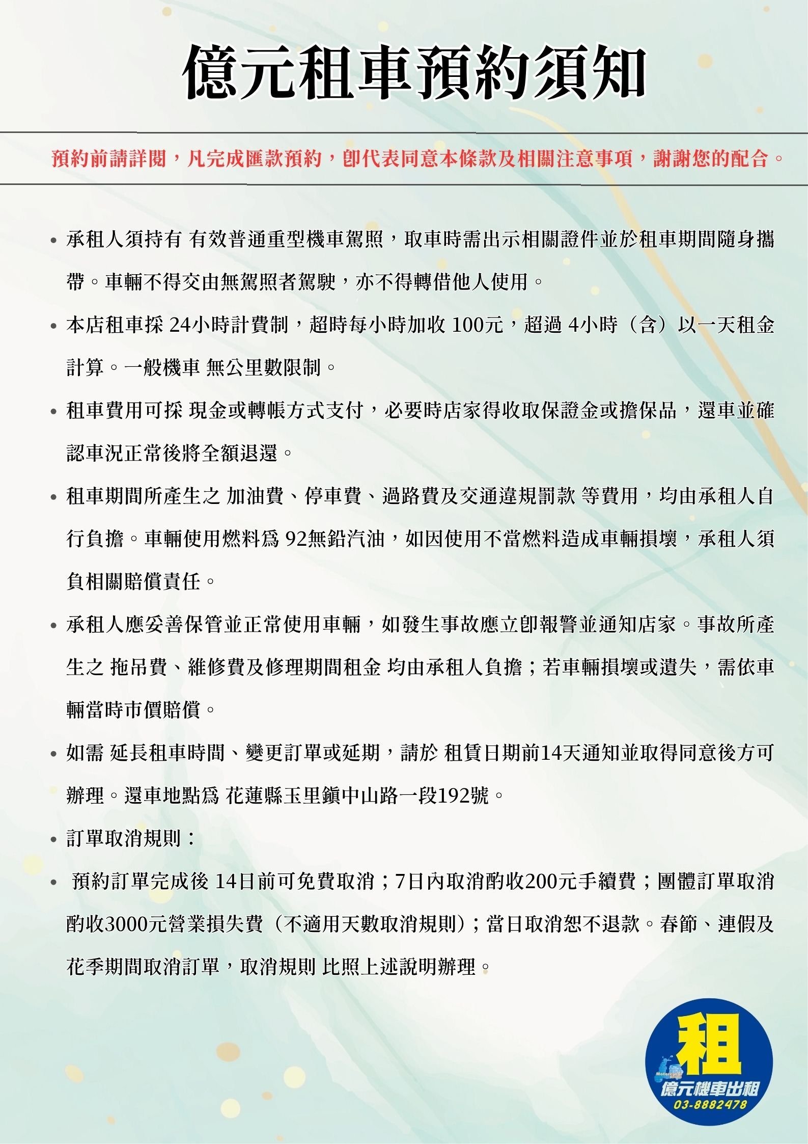 🛵 玉里租車、住宿一次搞定 1. 億元機車出租 位置:玉里圓環旁,交通極便利。 服務:觀光、洽公皆宜。 地址:花蓮縣玉里鎮中山路一段194號 - 2. 合作民宿 - 野間·澄光 特色:民宿座落在群山與萬畝良田之間,這裡沒有城市的喧囂與繁華,只有花東縱谷那溫柔的風,輕輕地、不間斷地穿過稻田與樹梢,演奏著大自然的樂章。 地址:花蓮縣玉里鎮城西一街三號 讓您在花東縱谷的假期,更輕鬆便捷。