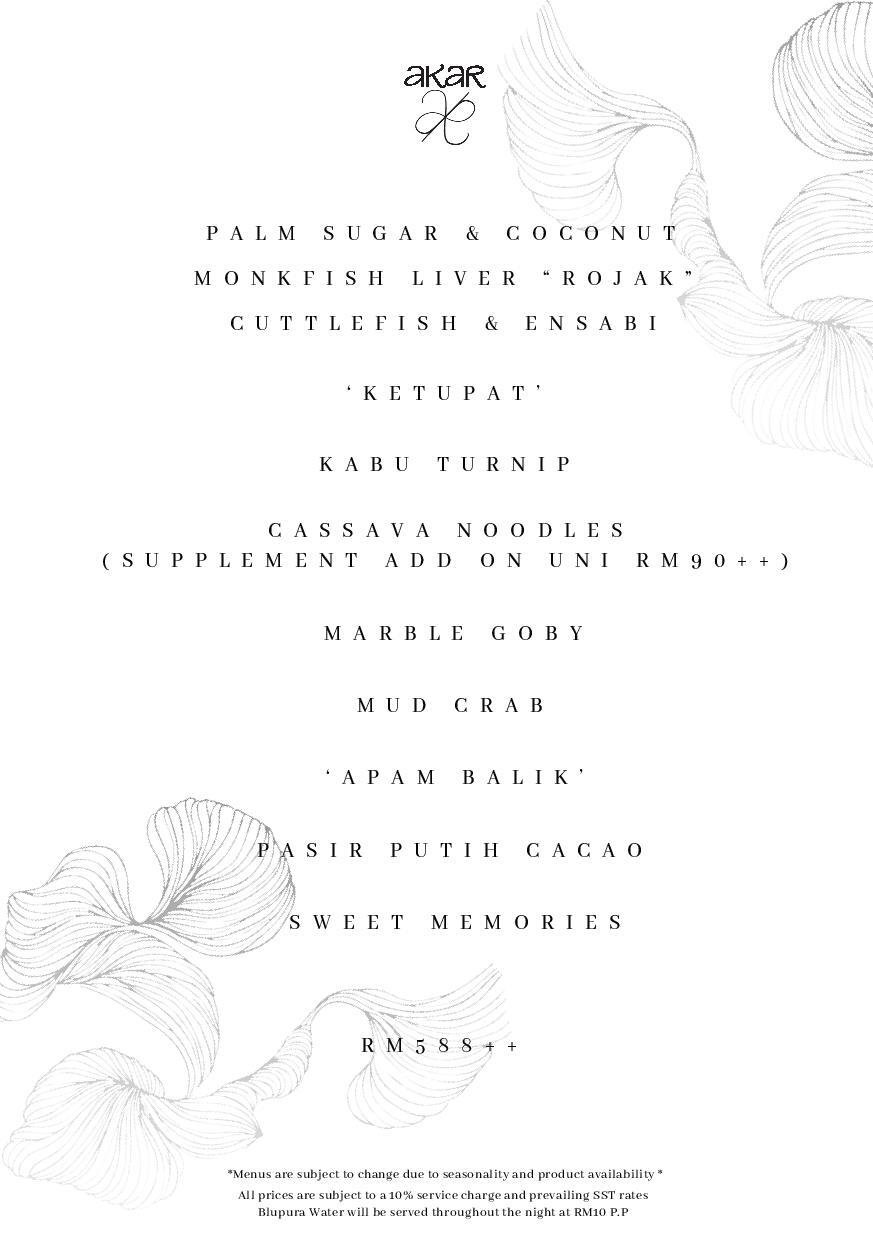 ・Embark on "Mekar," a journey through Malaysia's lush and vibrant ecosystems. Celebrate nature's bounty with local and indigenous ingredients, woven into a harmonious marriage of cultures. Indulge in a symphony of flavours where tradition and innovation blossom together.