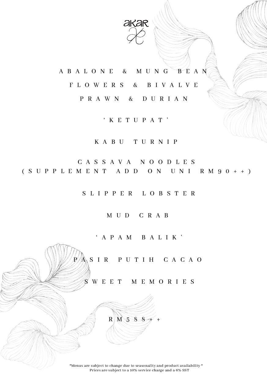 ・Embark on "Mekar," a journey through Malaysia's lush and vibrant ecosystems. Celebrate nature's bounty with local and indigenous ingredients, woven into a harmonious marriage of cultures. Indulge in a symphony of flavours where tradition and innovation blossom together.