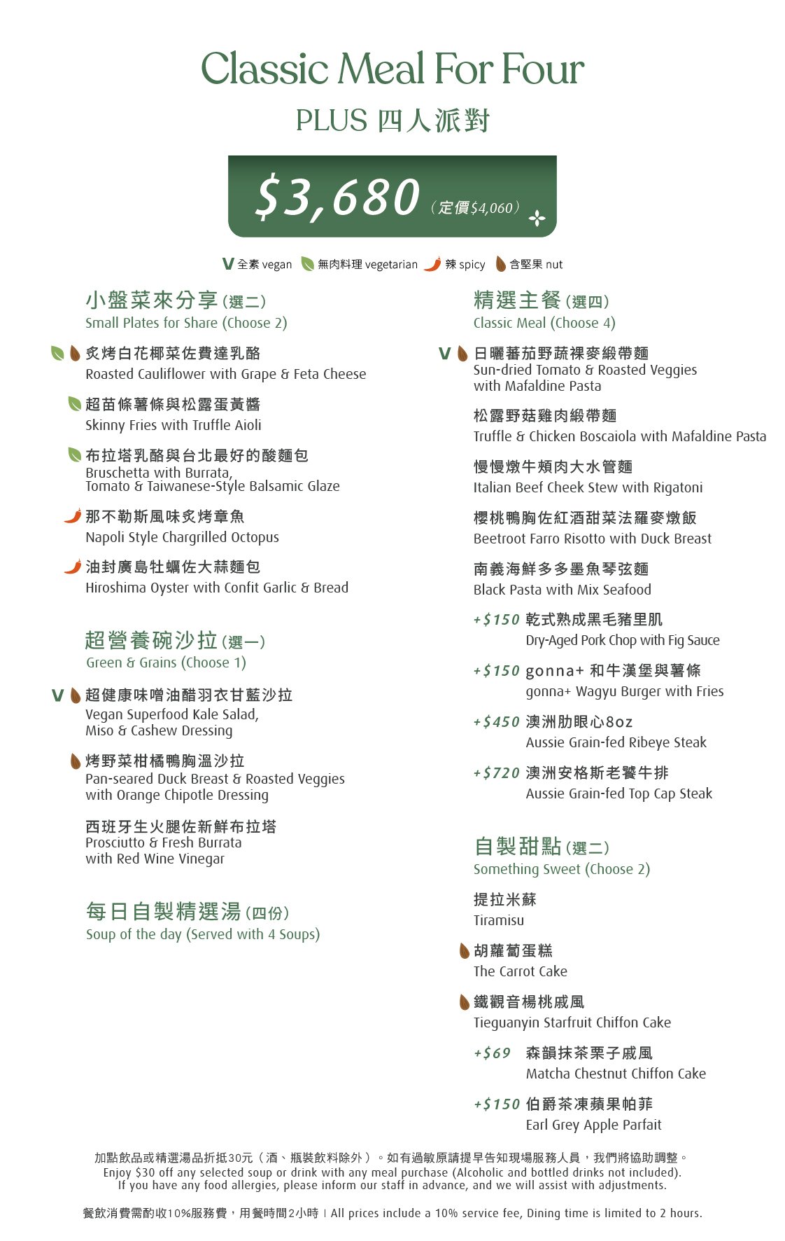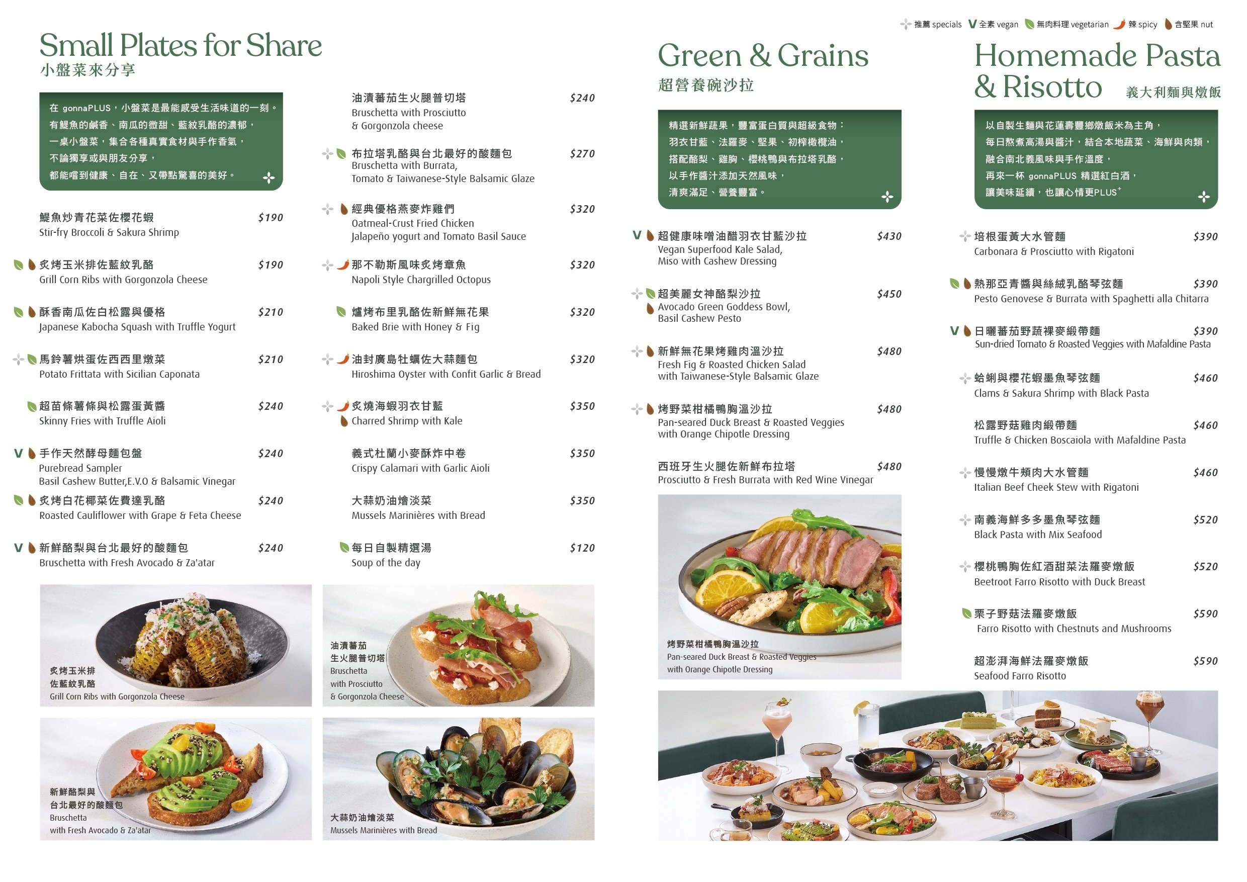 gonnaPLUS Mediterranean Prototype Food Restaurant is a flagship healthy restaurant in Taipei's Xinyi District, focusing on prototype foods. Enjoy delicious meals together without the burden. Eat well IS GONNA be a PLUS! Continuing the goonaEAT brand philosophy, we offer a balanced diet of good meats and vegetables.