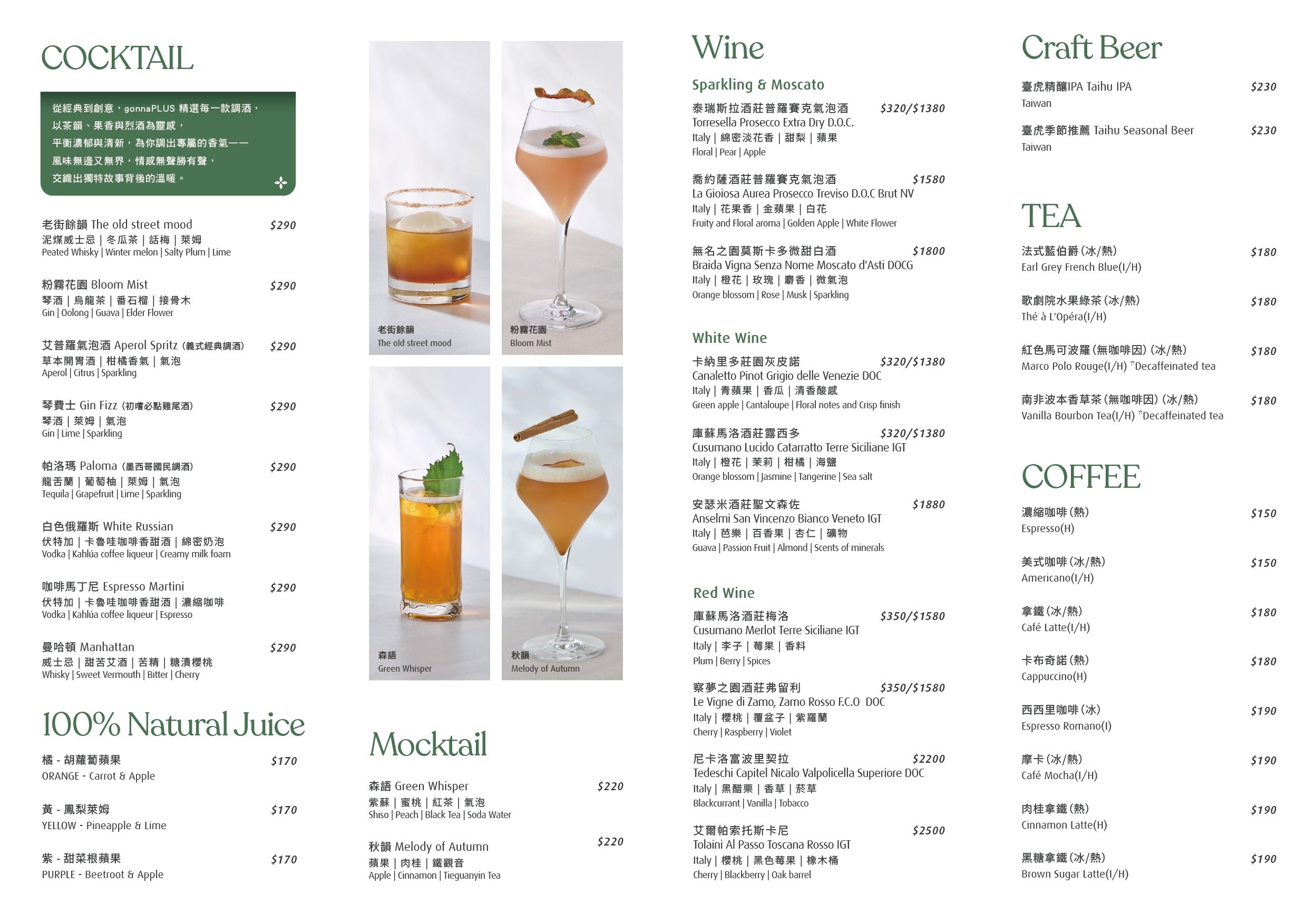 - 自帶酒水,需收開瓶費烈酒類每瓶 TWD 1000、葡萄酒類每瓶 TWD 800 ( 可以開一瓶 gonna+ 的紅白酒抵一瓶開瓶費 )