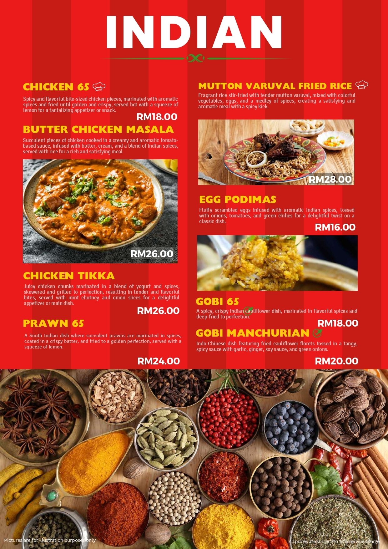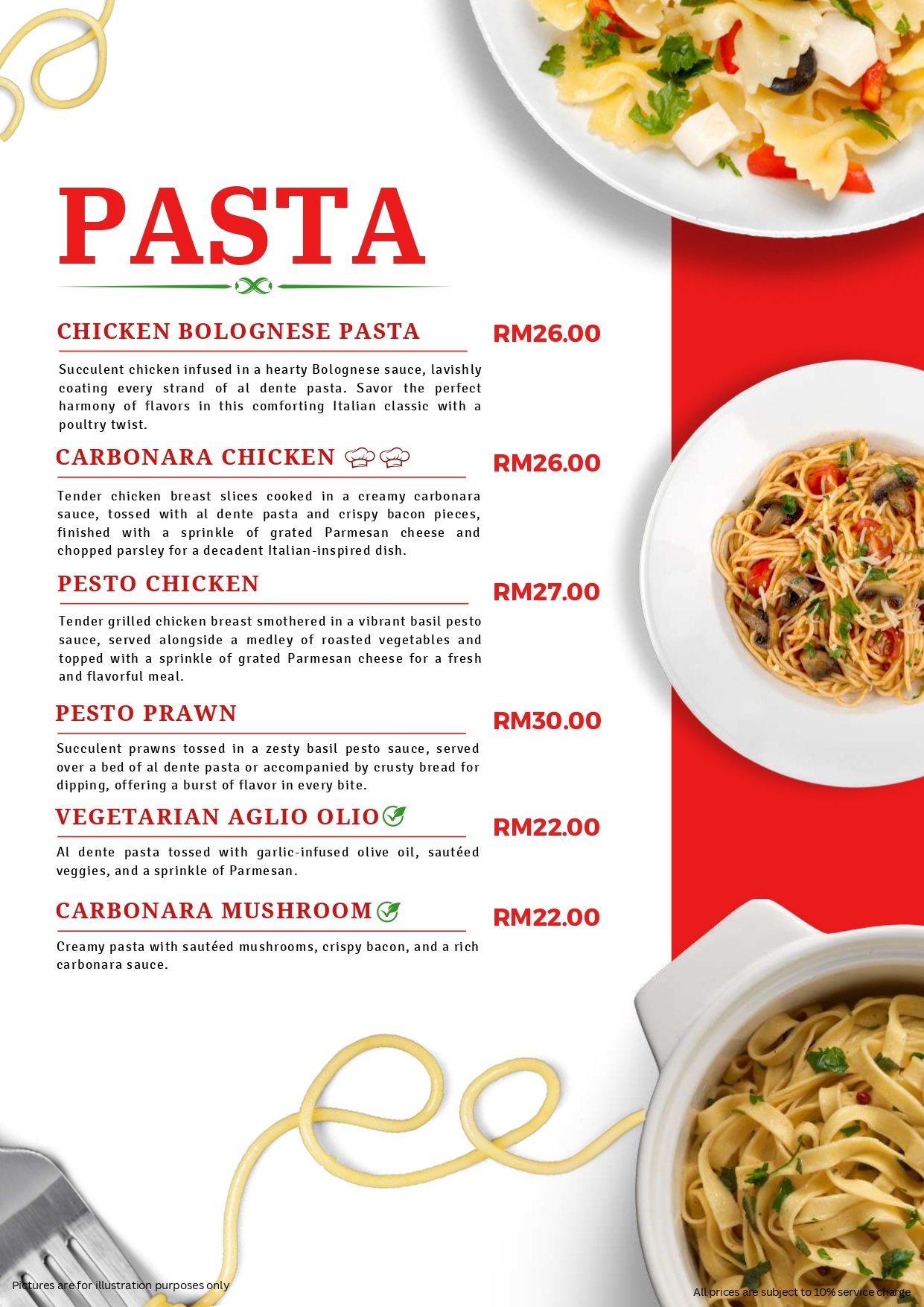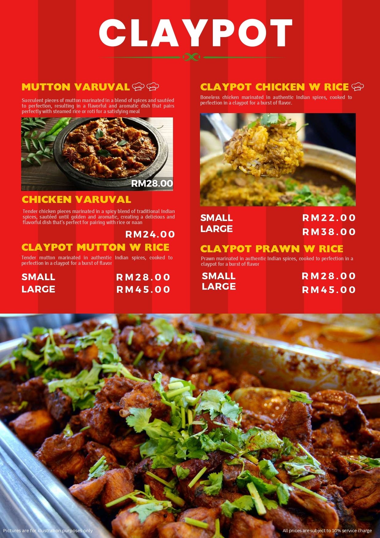 - Pictures shown are for illustrations purpose only. Dishes ordered are subject to daily menu provided.