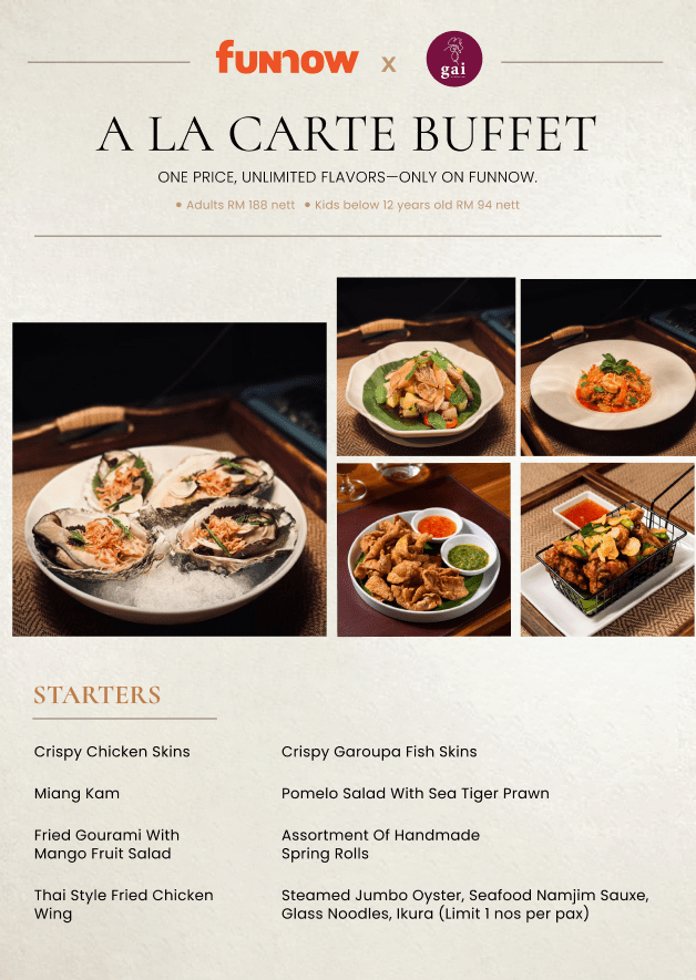 Gai (Thai for chicken) delivers tasty northern Thai food to the people of KL. The restaurant embodies the spirit of family and dishes are best shared for a group. Donโt miss Papa Suwit's tom saeb oxtail stew; a spicy-sour broth that boasts intense flavour from a mix of vegetables and herbs. The signature free-range chicken is grilled with a secret family recipe that emits a pleasant, chargrilled aroma. There are several seafood options too, including the flower crab.