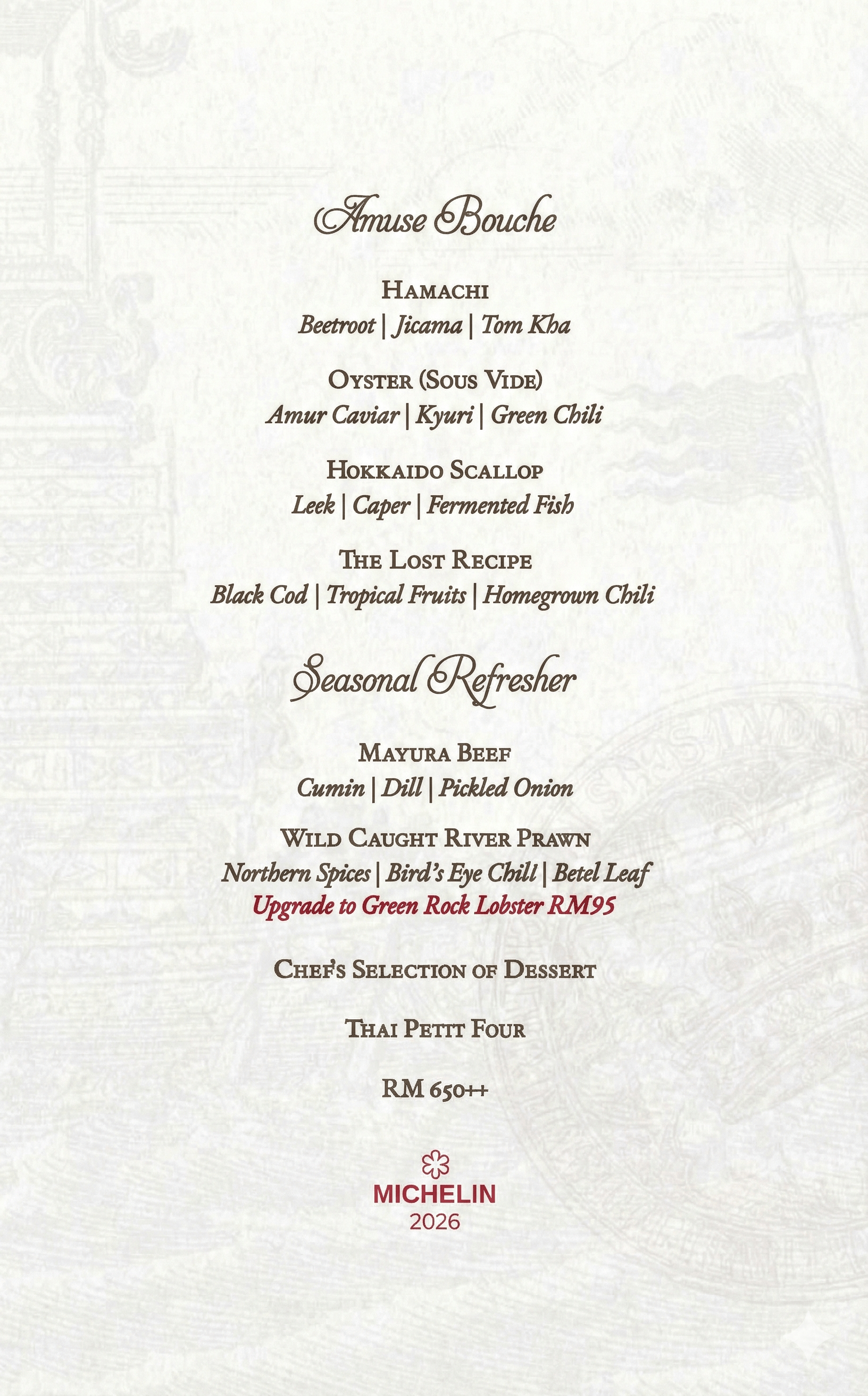In 2015, Chef Willy returned to his hometown to care for his parents and continue his career. In 2022, the restaurant where he was working was shortlisted for the Michelin Guide Malaysia. Chef Willy’s dishes are crafted to bring joy and leave a lasting impression, reflecting his extensive culinary journey and passion for the art of cooking.