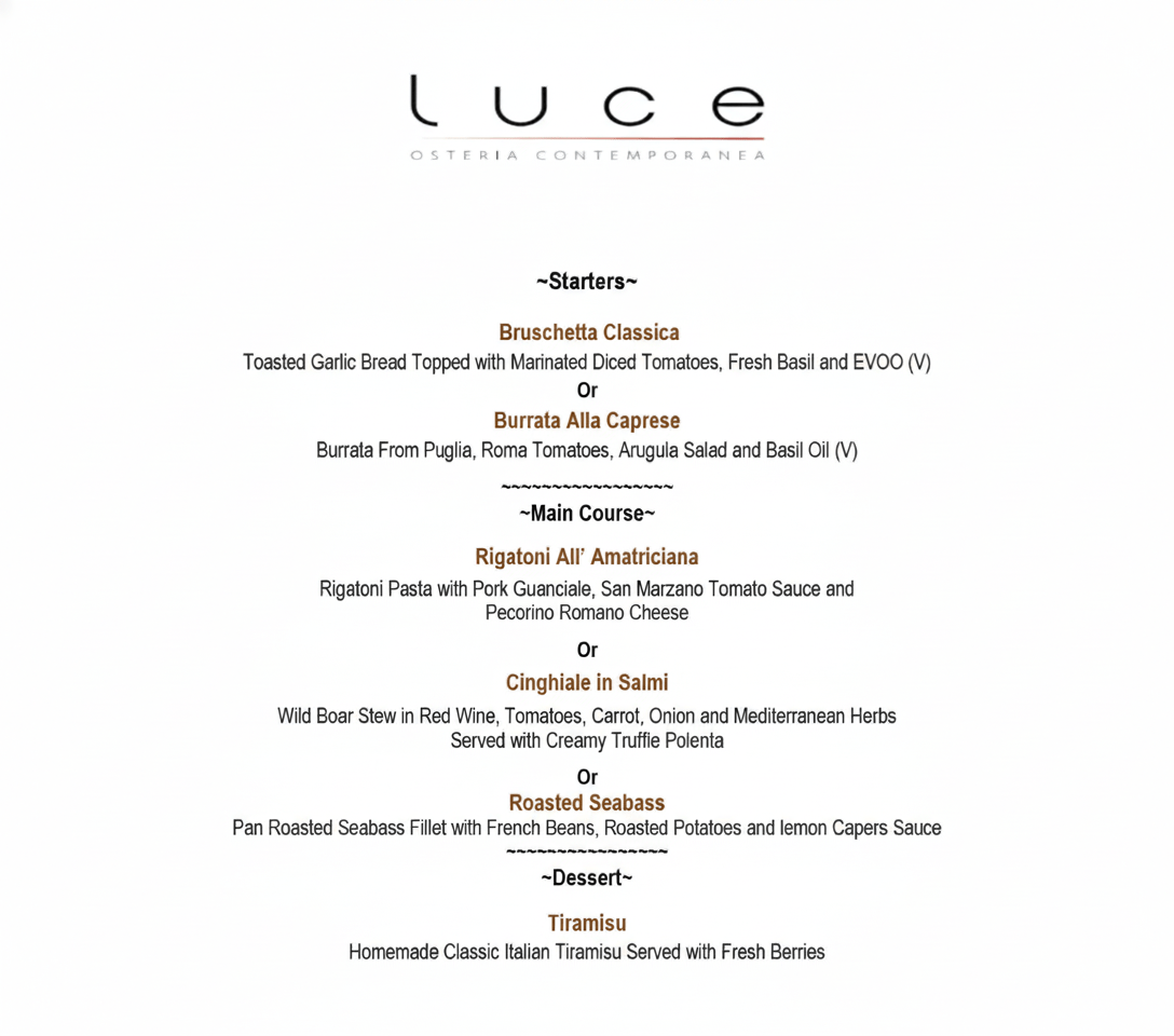 Exclusively for FunNow users, enjoy a specially curated Italian set menu designed to showcase Luce’s signature flavours. This set menu offers a balanced, elevated dining journey that highlights the restaurant’s culinary craftsmanship through a thoughtfully curated experience.