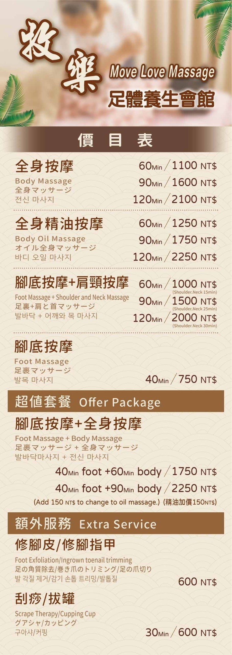 牧樂足體養生會館是有超高評價的中山區按摩店。店內的按摩師都是業內相當知名且資歷深厚的老師親自為您服務,精通手技且對於人體經絡、骨骼、肌肉的組成相當了解,因此更加能針對每個人不適的狀況做最個人化的調理。 #南京復興按摩 #南京東路按摩 #TaipeiMassage #타이페이마사지 牧樂足體養生會館評價:Google 4.9 星。 牧樂足體養生會館舒適的現代化裝潢、設寬敞的個人按摩包廂,就是要給每一位來訪紓壓的您最好的體驗! 牧樂足體養生會館預約、牧樂足體養生會館價格、牧樂足體養生會館優惠立刻查看⬇︎