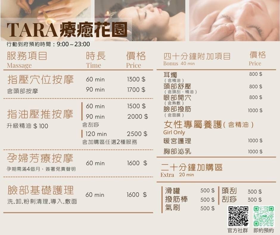 TARA療癒花園美容工作室——您的專屬芳療師,為您帶來全方位的健康與美麗呵護! 我們除了店面服務外,也提供到府服務,專業細心的芳療技術結合天然精油,讓您享受身心靈的極致放鬆。服務項目涵蓋身體保養、臉部護理、孕婦按摩、纖體瘦身、美胸泌乳、暖宮婦科、眼部按摩及顱沐放鬆,針對不同需求提供個人化調理。 此外,我們也承接工商團體活動與保健講座,協助企業與團體推廣健康管理理念。 無論是日常舒壓或深度保養,TARA療癒花園都願成為您的健康美麗夥伴! 📅 預約時間:10:00-22:00