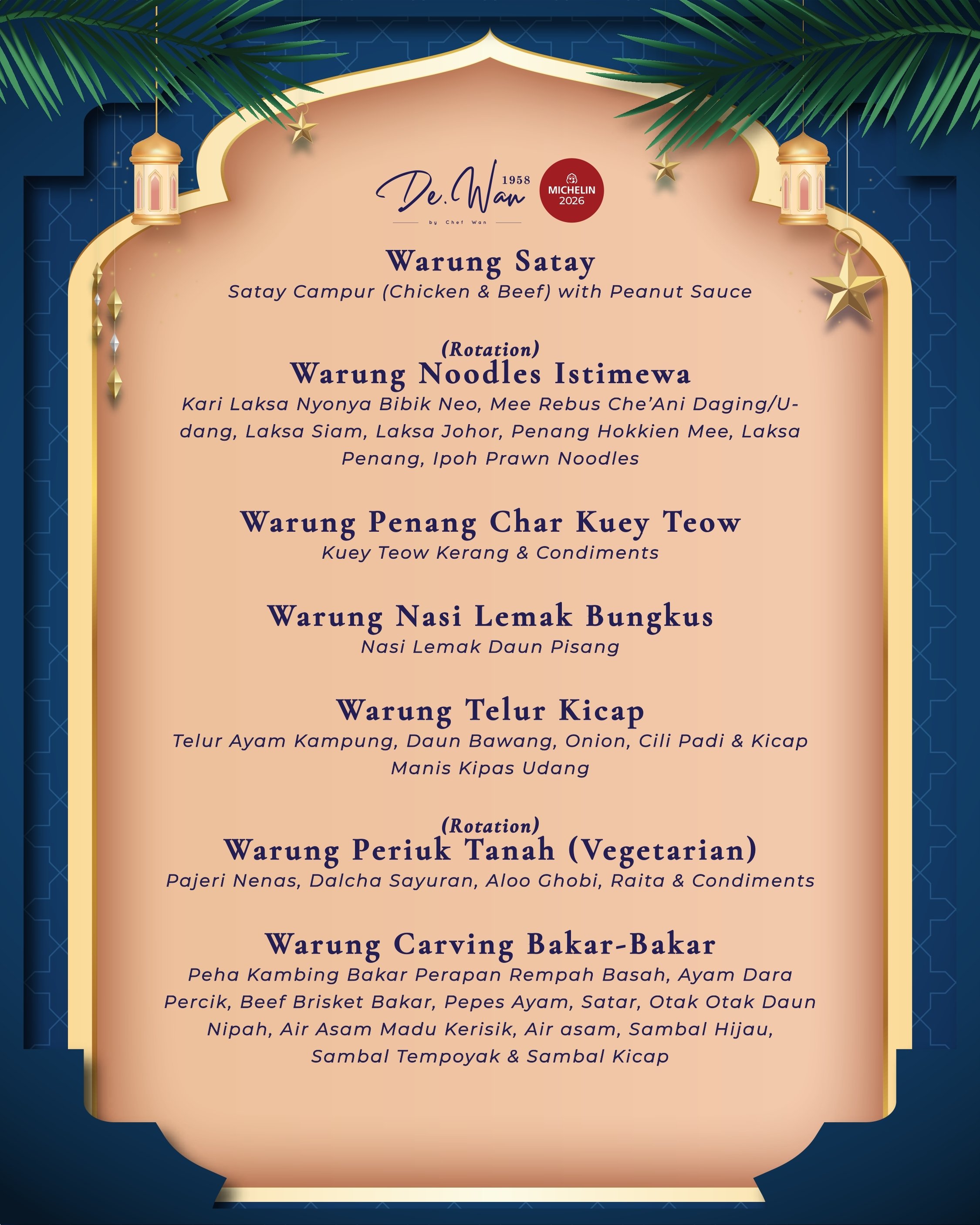 The menu is a dazzling showcase of Chef Wan's most treasured recipes, where every bite of the fork-tender Rendang Daging 'Tok' or the creamy Gulai Lemak Udang Nenas tells a story of tradition. The stunning, theatrical setting makes every meal feel like a grand celebration, infused with the warm, generous spirit of Malaysian hospitality that Chef Wan himself embodies.