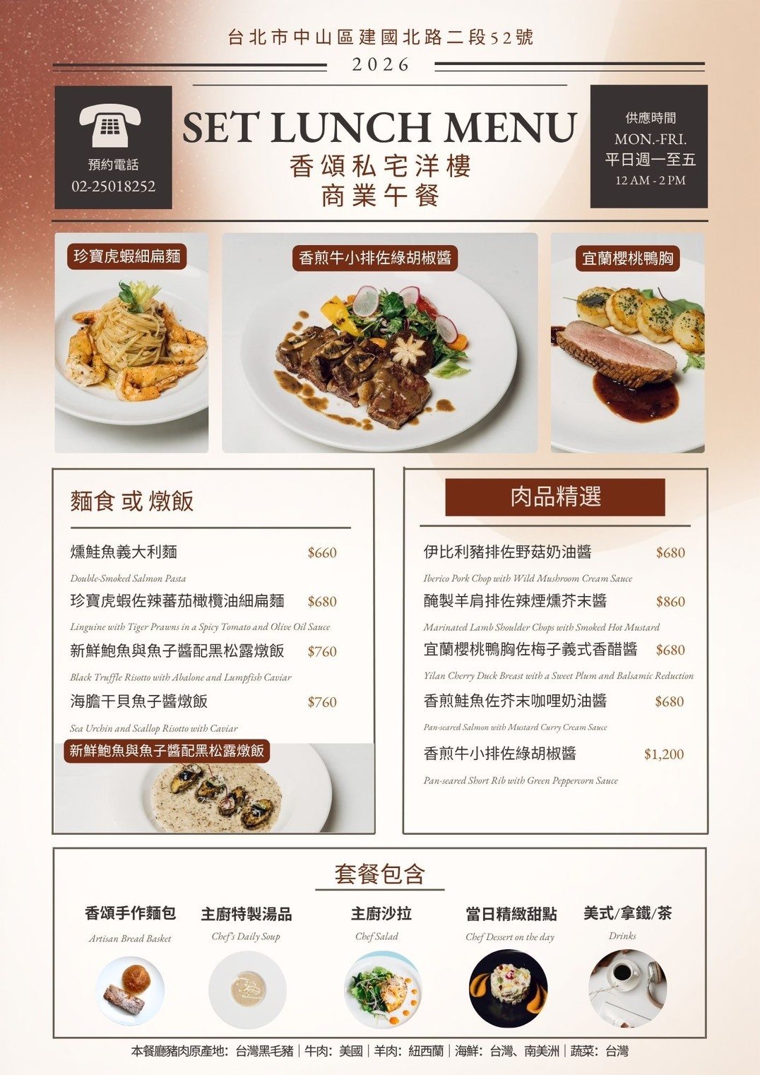 ・香頌私廚每日提供 9 種主餐,請於頁面下一步選擇。