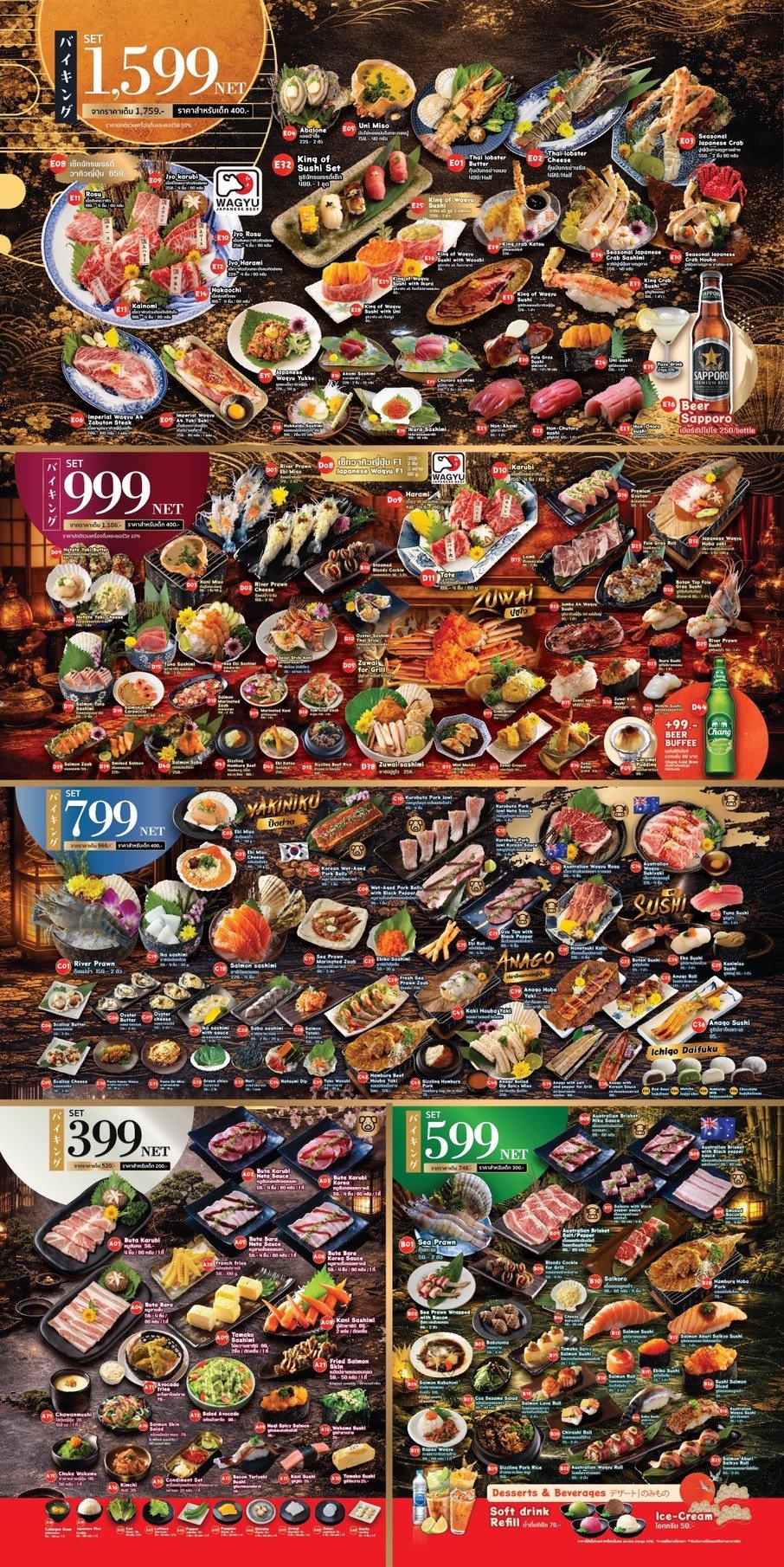 บุฟเฟ่ต์ทานไม่อั้น: ️1599 NET (จากราคาเต็ม1759) พิเศษ 2 ชั่วโมงเต็ม ขาปูทาระบะ ไม่อั้น กุ้งมังกรหอยเป๋าฮื้อ ชูโทโร่ซาซิมิ เนื้อวากิวจักรพรรดิ A4 ซูชิโอโทโร่ ซูชิไข่หอยเม่น ฟัวกราส์ น้ำเก็กฮวย Sapporoไม่อั้น
