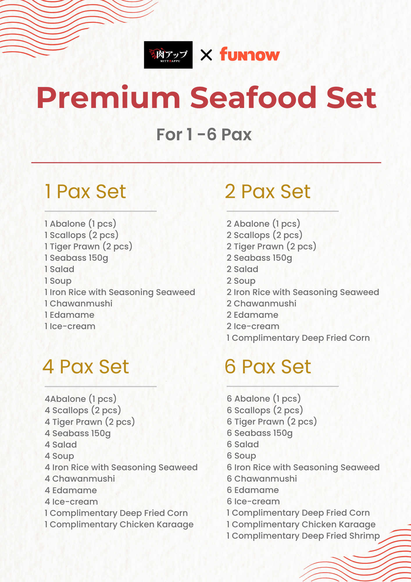 ・Include Abalone (1 pcs), Scallops (2 pcs), Tiger Prawn (2 pcs), Seabass 150g (Salad, Soup, Iron Rice with Seasoning Seaweed, Chawanmushi, Edamame & Ice-cream) & 𝐅𝐮𝐧𝐍𝐨𝐰 𝐄𝐱𝐥𝐜𝐮𝐬𝐢𝐯𝐞 𝐂𝐨𝐦𝐩𝐥𝐢𝐦𝐞𝐧𝐭𝐚𝐫𝐲 𝐃𝐢𝐬𝐡𝐞𝐬