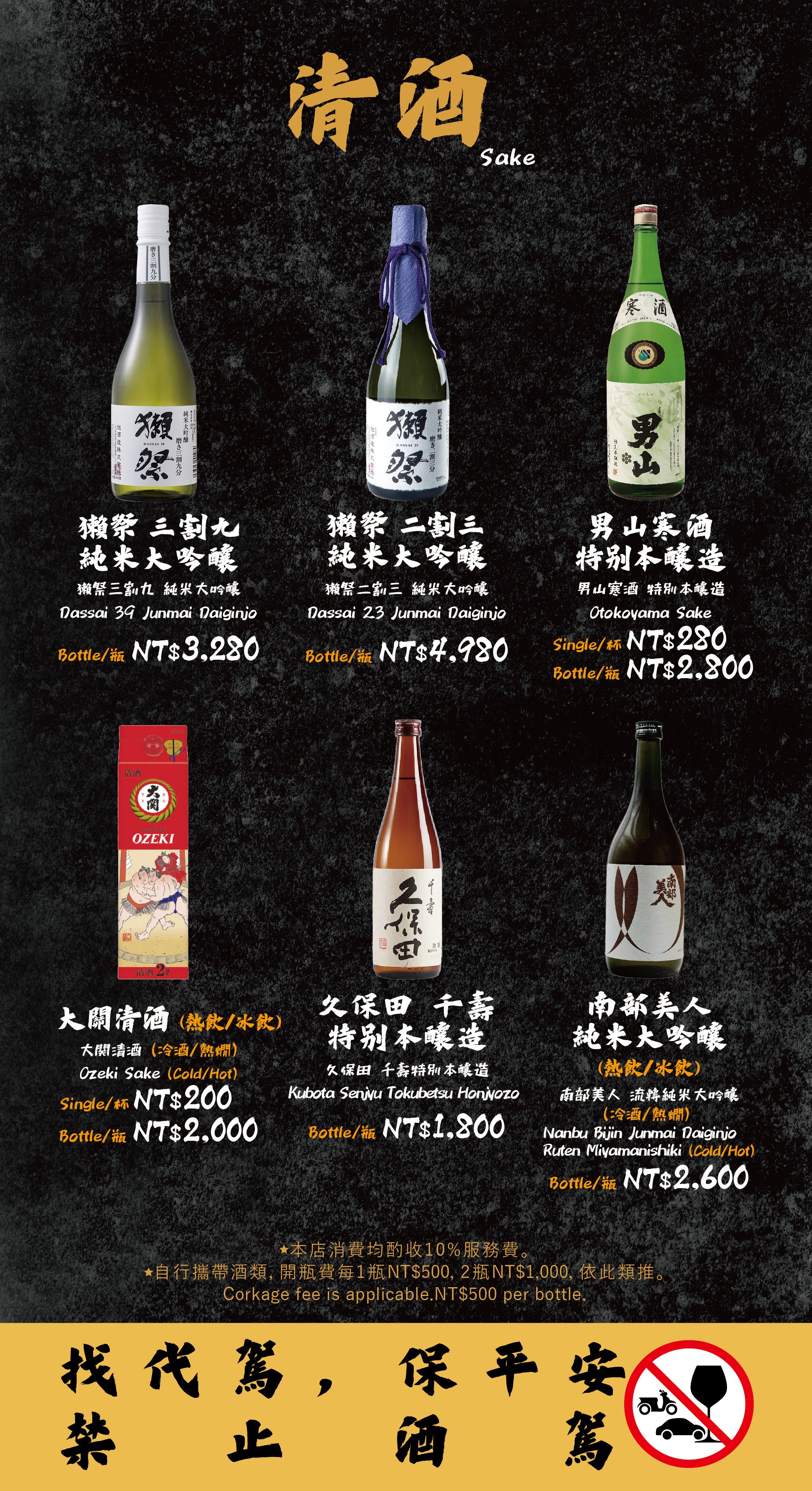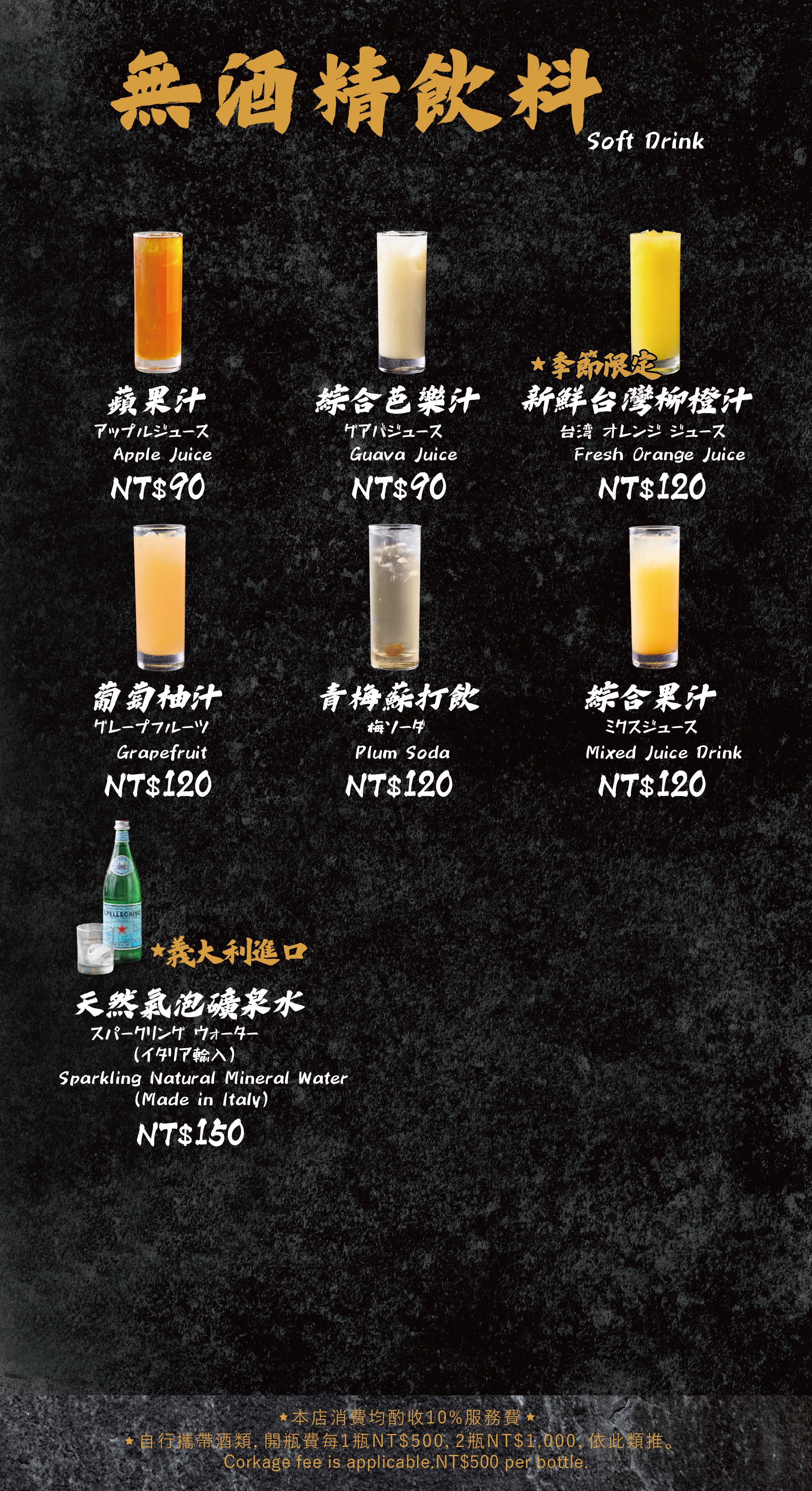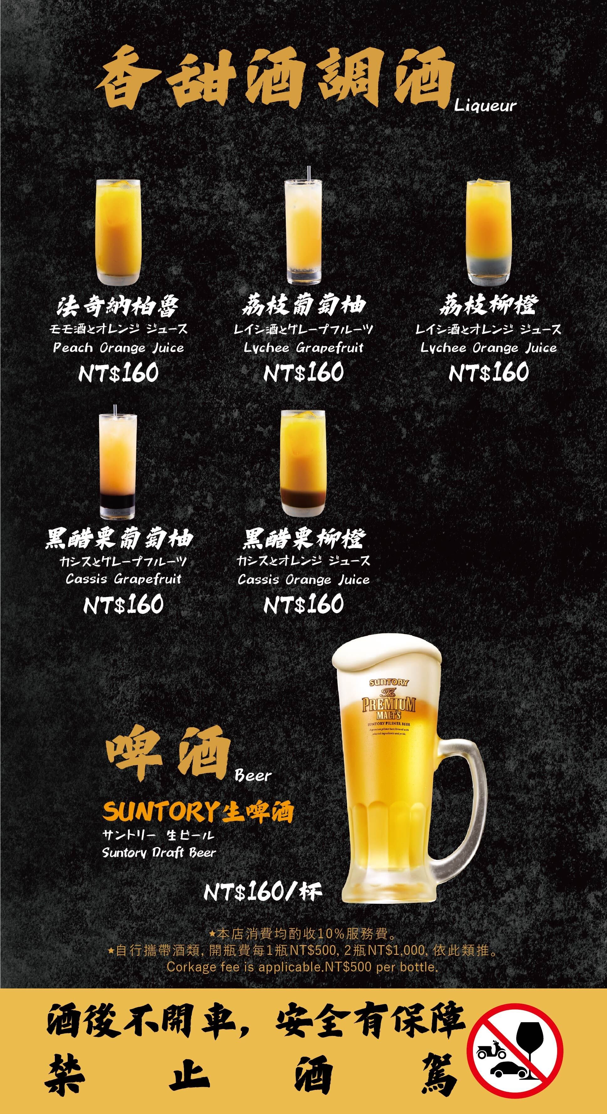 - 自帶酒水,需收開瓶費每瓶 TWD 500。