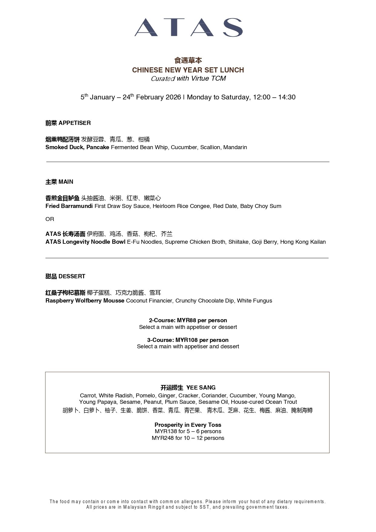 Gather this Chinese New Year over set lunches inspired by Traditional Chinese Medicine, featuring thoughtfully selected herbs with Virtue TCM and comforting local flavours that celebrate the warmth of festive family meals.