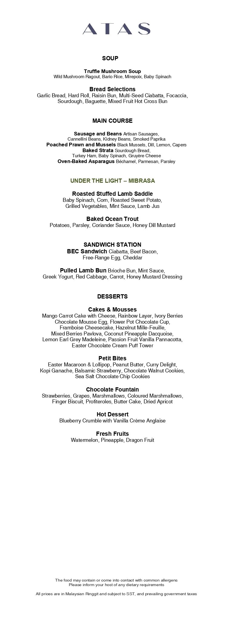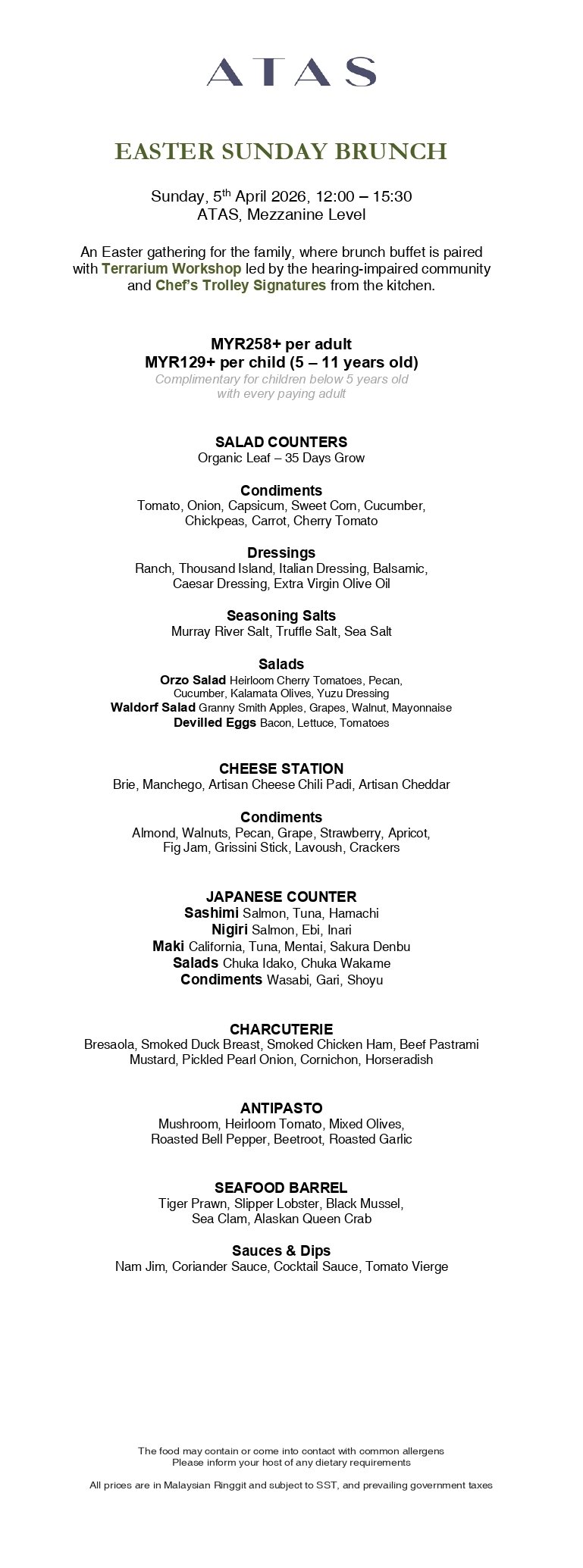 ・Easter Sunday Brunch is available from 12:00 - 15:30 at MYR273.50 nett per adult / MYR136.70 nett per child (5 - 11 years old). Complimentary for children below 5 years old with every paying adult.