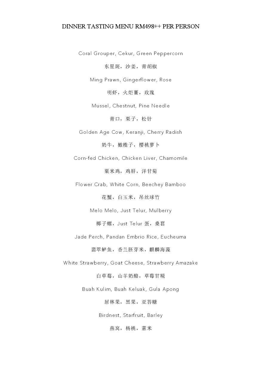 - Kindly indicate your dietary restrictions and special occasions upon making reservations, 48 hours prior to your dining-in date. We apologise that we aren’t able to accommodate gluten-free and vegan diets for the current menu. A RM120 surcharge applies for shellfish or seafood allergies.