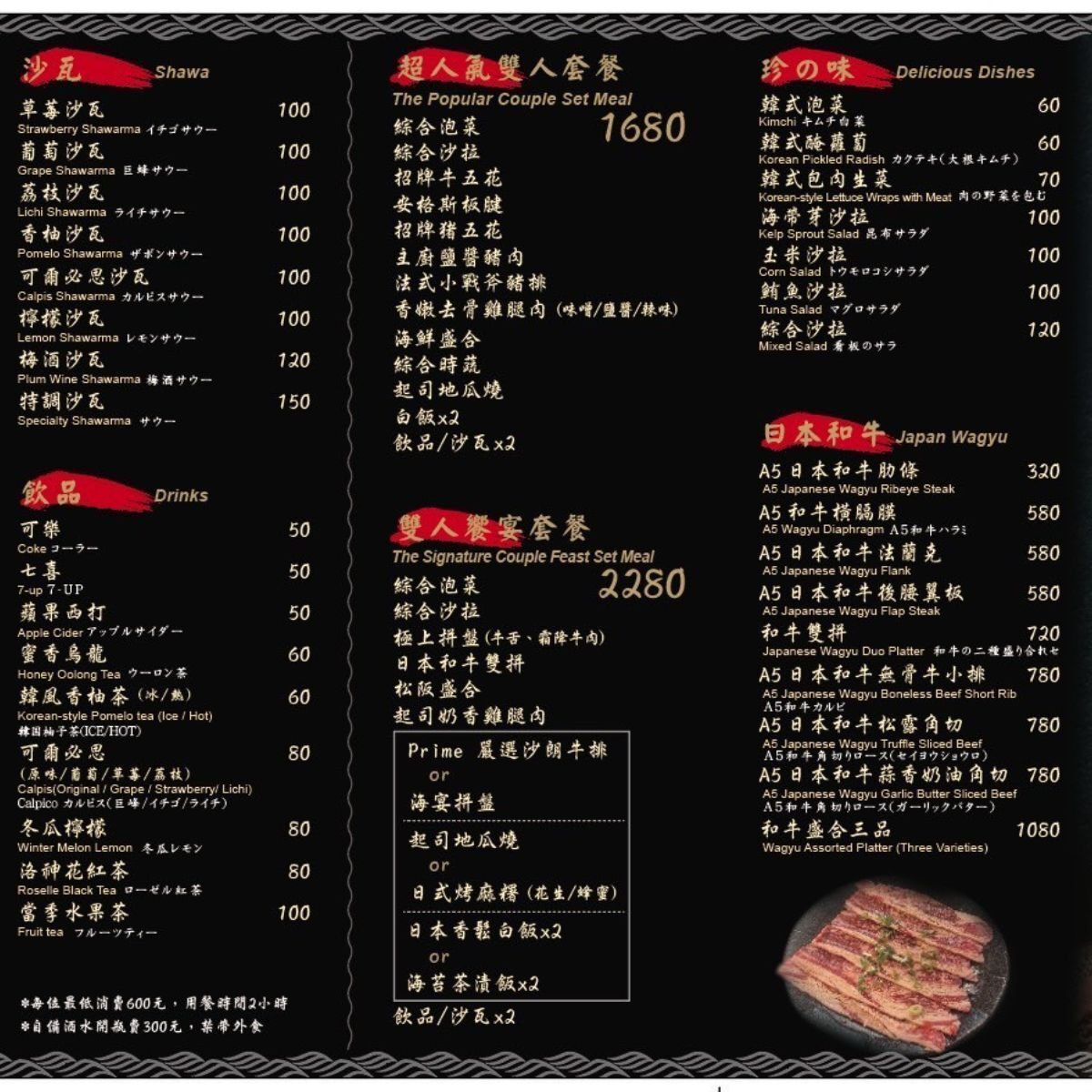 ・店內低消為 TWD 600,均消為 TWD 600 - TWD 1000。
