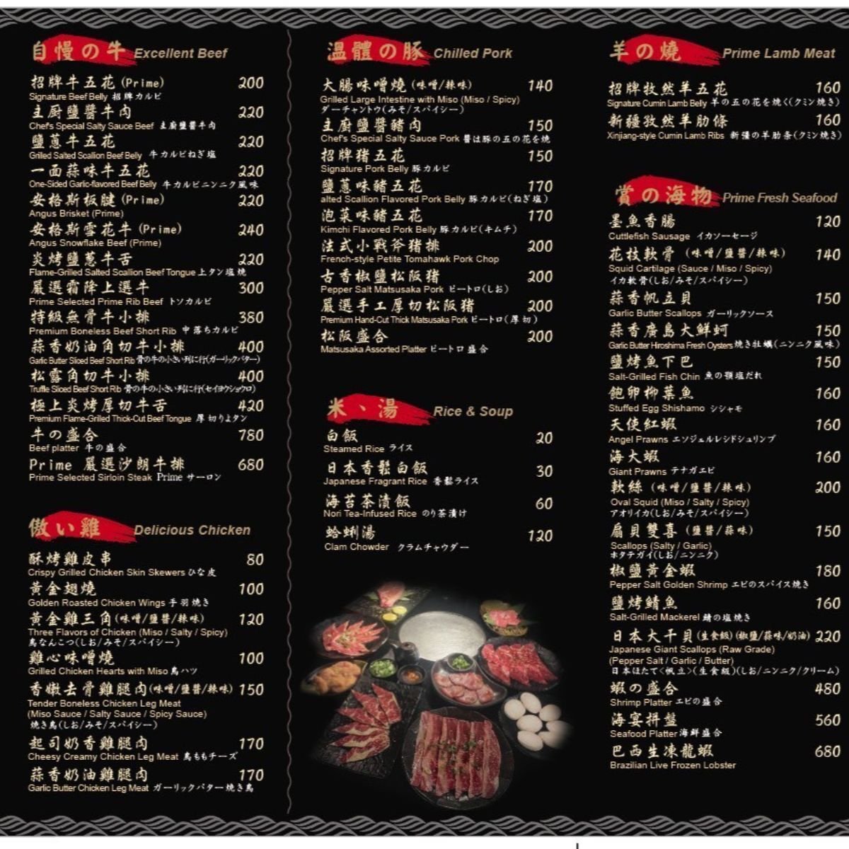 老馬燒肉菜單必點:招牌牛五花、炎烤鹽蔥牛舌、嚴選霜降上選牛、Prime嚴選沙朗牛排。