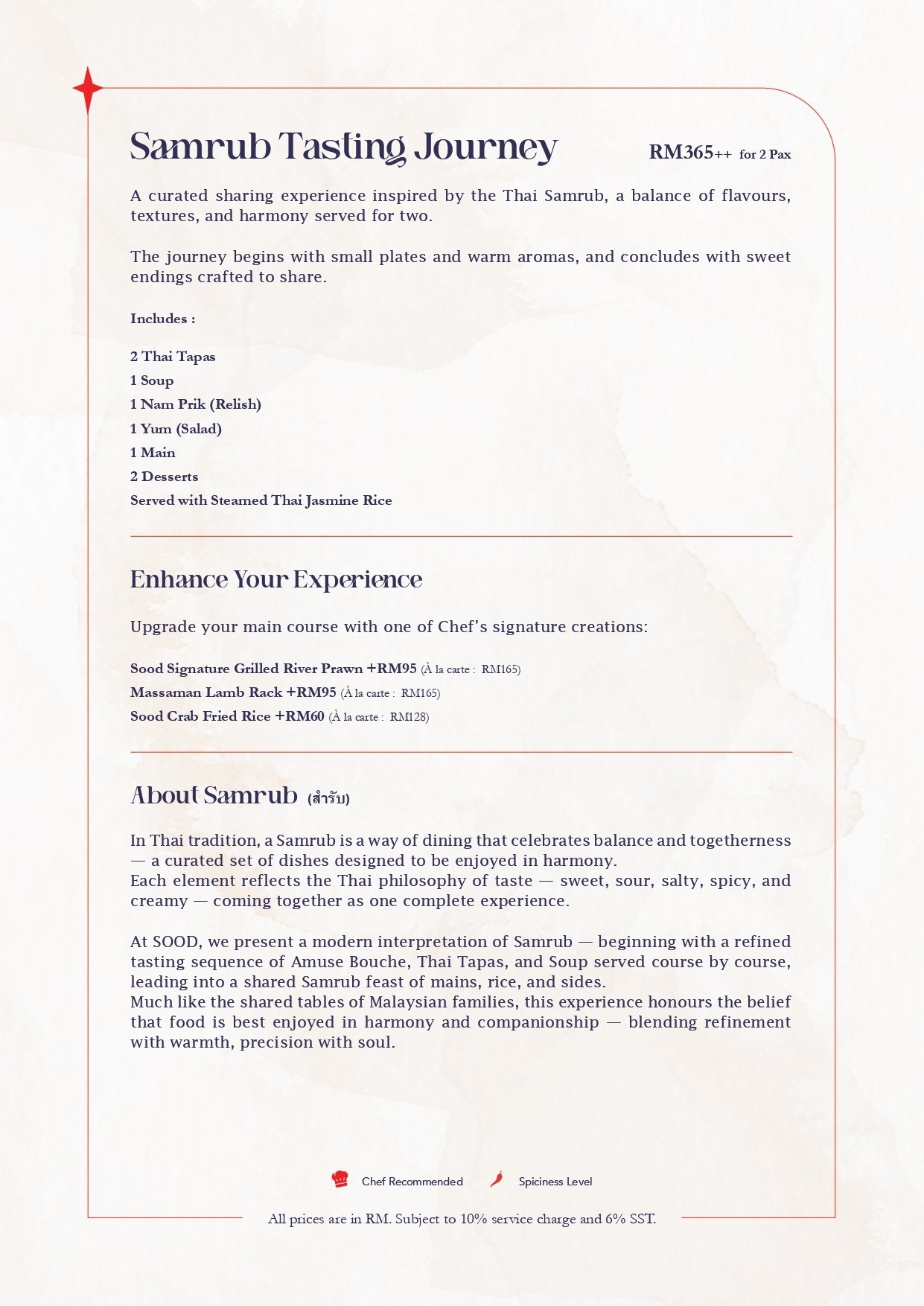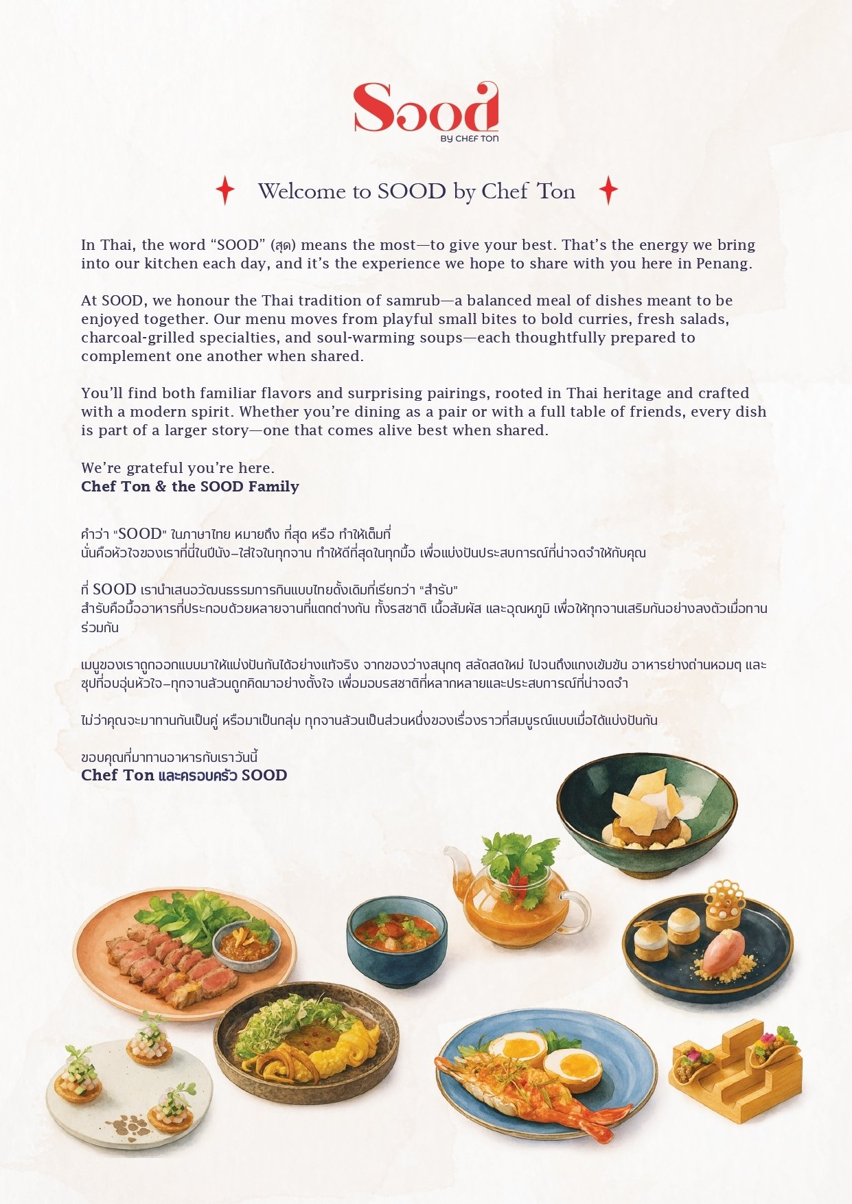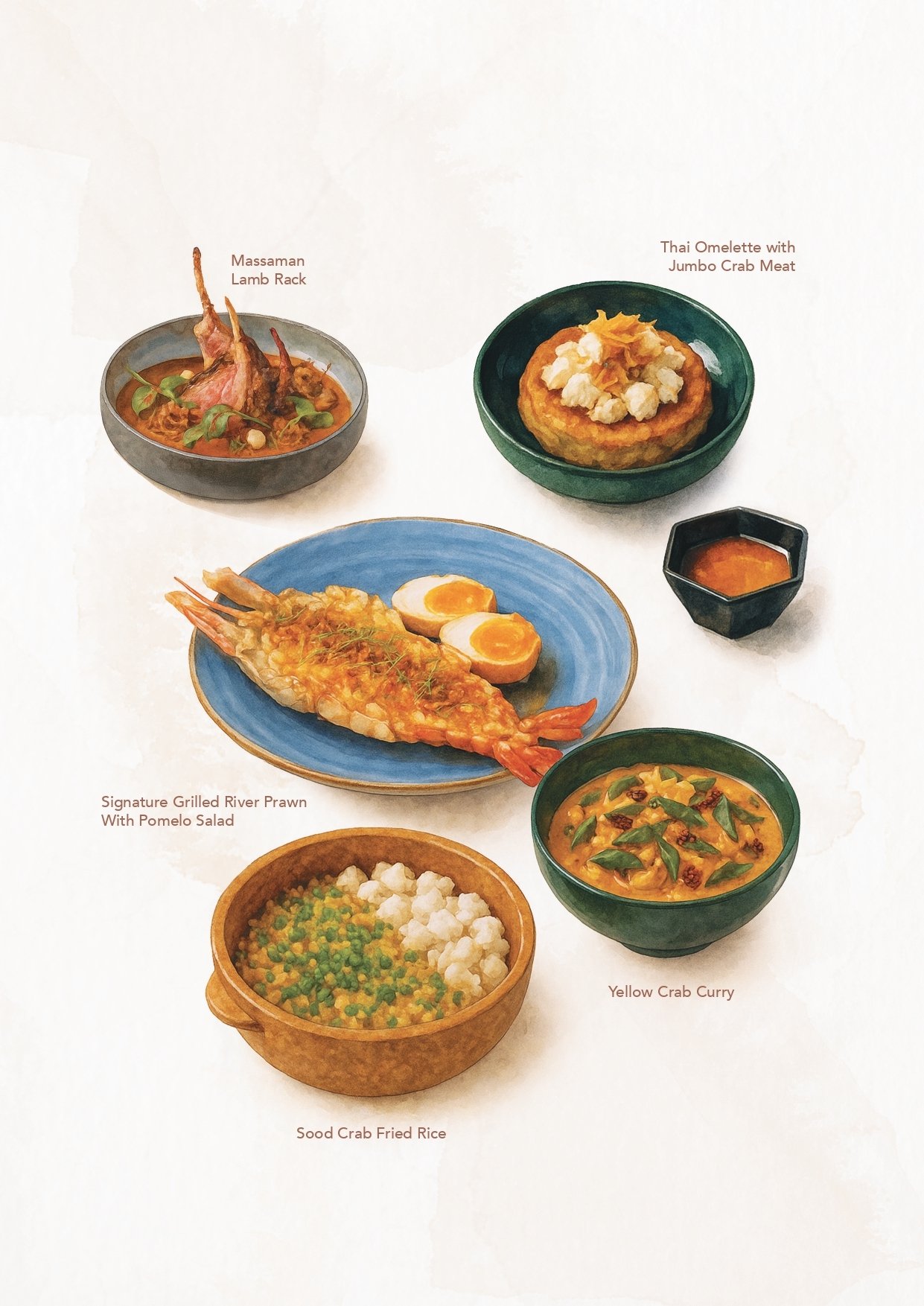 ・A curated sharing experience inspired by the Thai Samrub, celebrating balance in flavours, textures, and harmony. The journey begins with small plates and warm aromas, and concludes with sweet endings crafted to share.