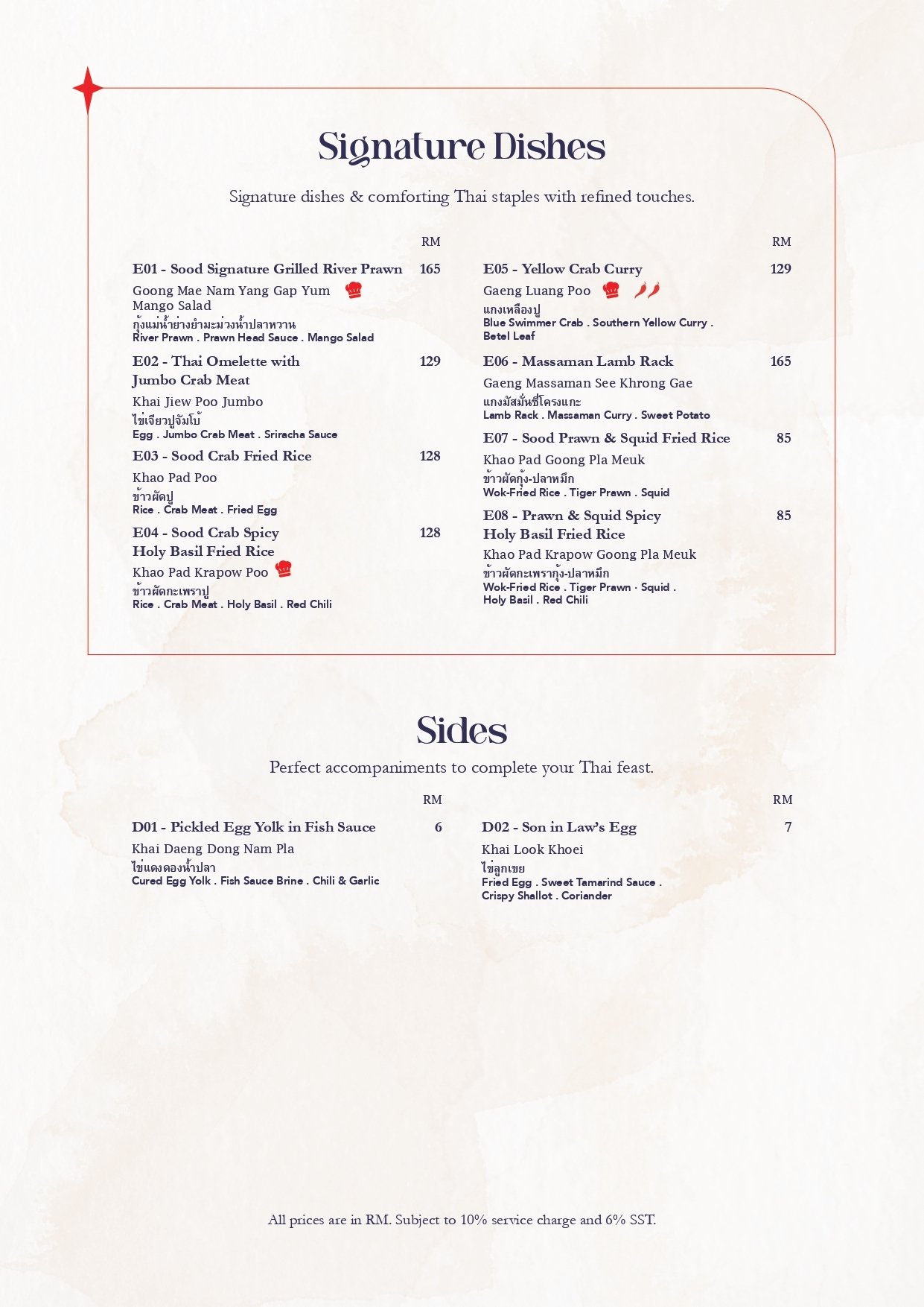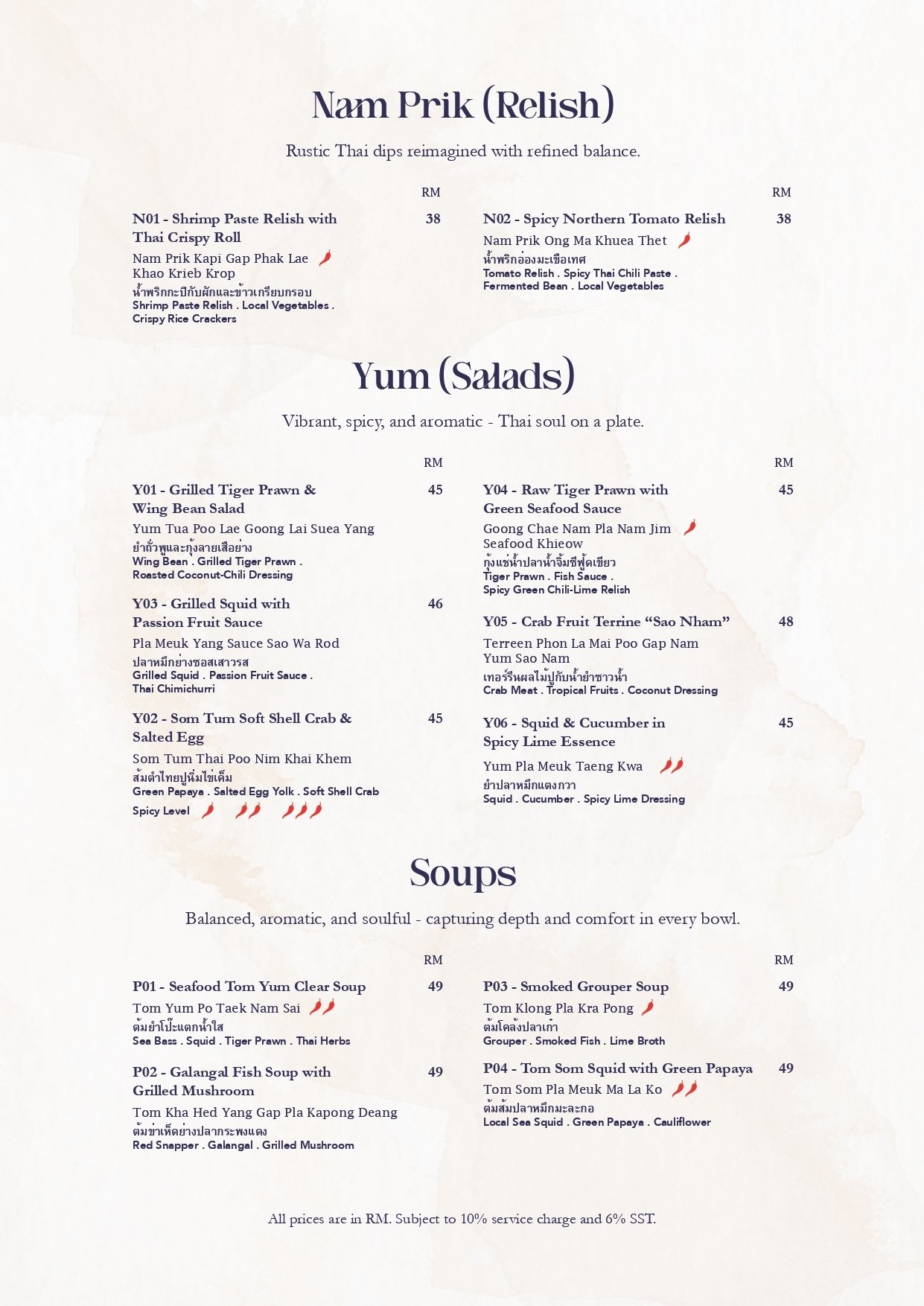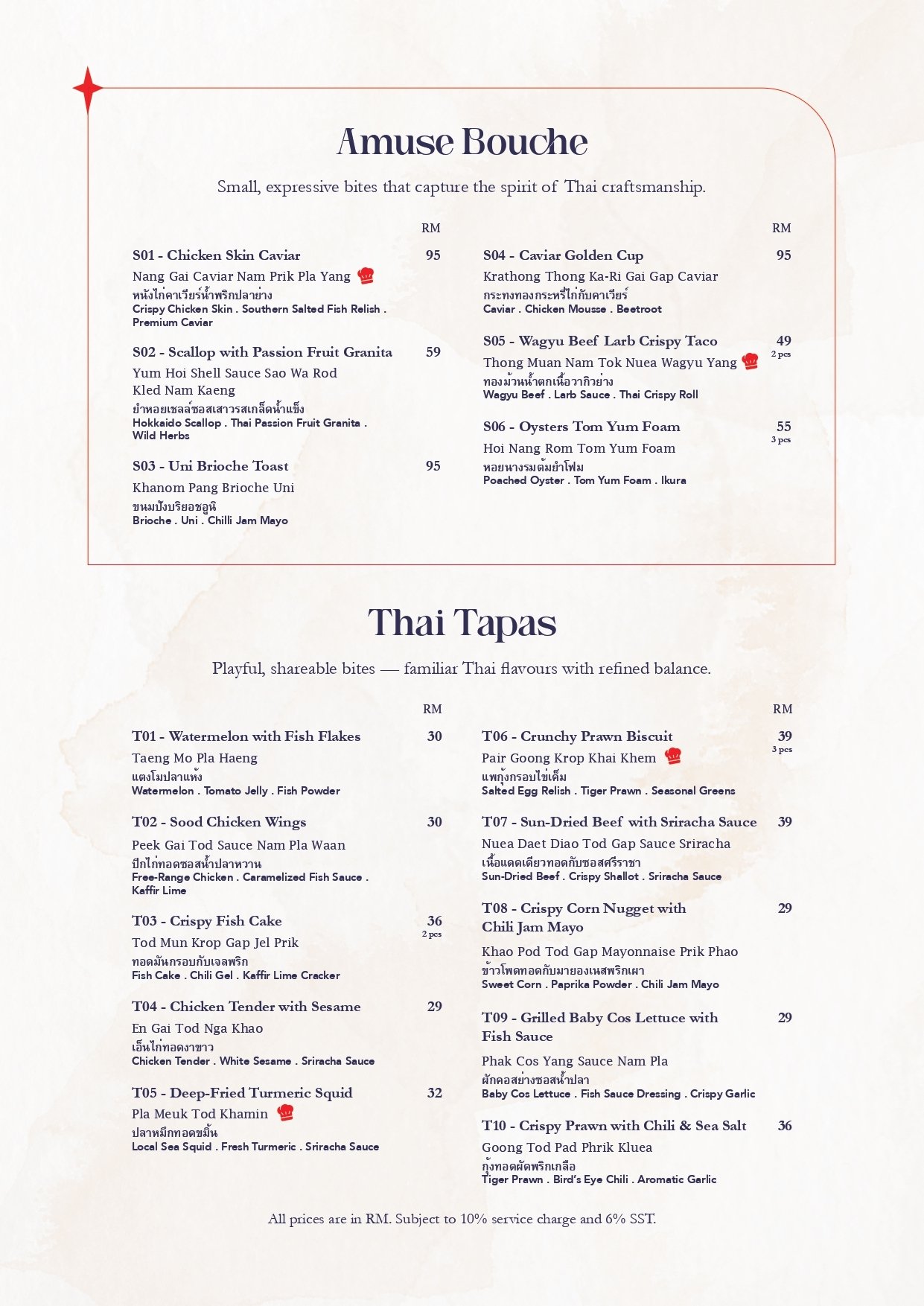 ・A curated sharing experience inspired by the Thai Samrub, celebrating balance in flavours, textures, and harmony. The journey begins with small plates and warm aromas, and concludes with sweet endings crafted to share.