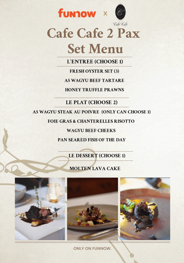 ・Savor an exquisite Parisian-inspired 2 Pax Set Menu at Cafe Cafe. Highlights include decadent A5 Wagyu Beef Tartare, Foie Gras Risotto, and a rich, indulgent Molten Lava Cake.