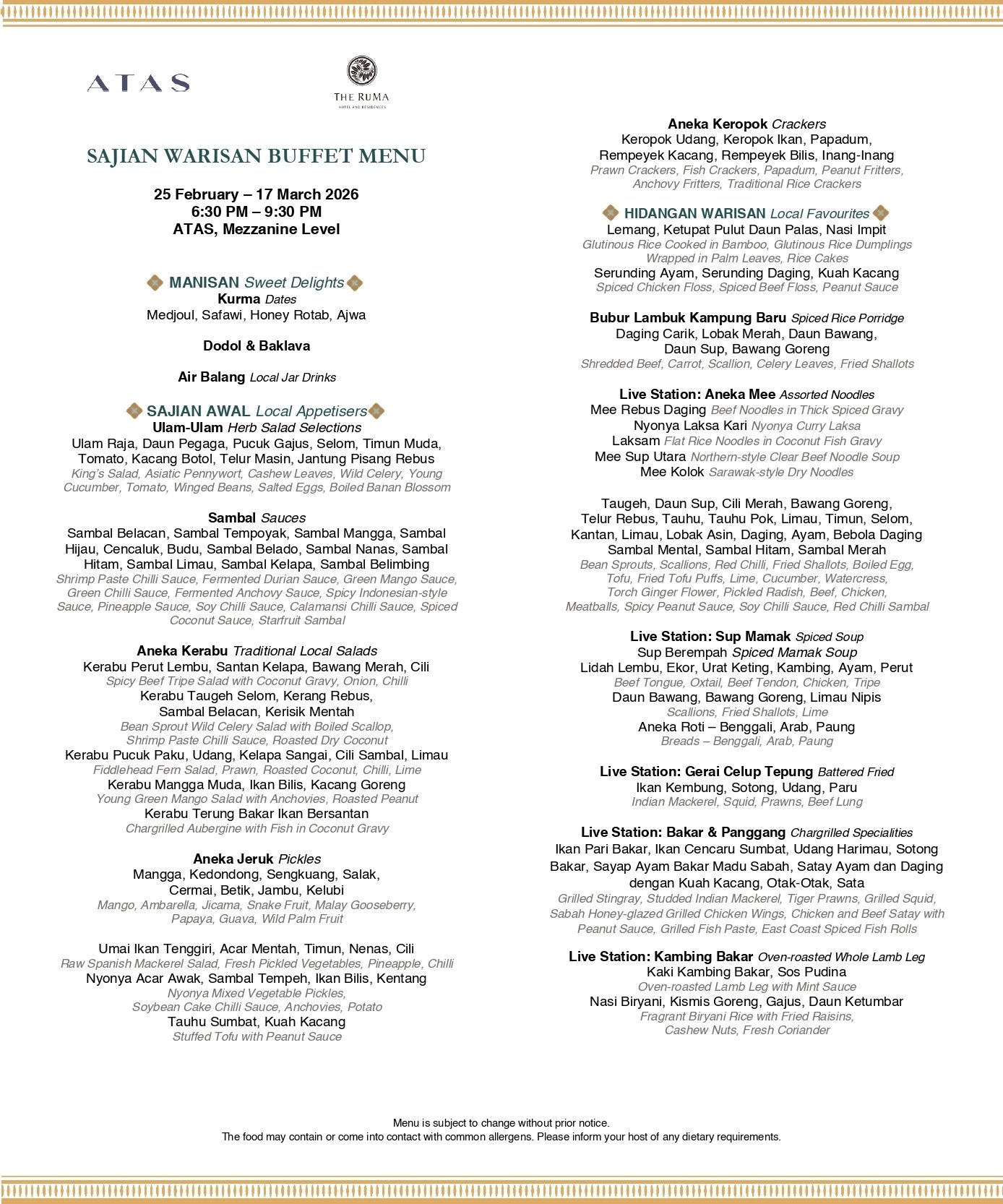 ATAS – A Refined Expression of Malaysian Heritage. Ascending The RuMa Hotel and Residences’ iconic spiral staircase to ATAS, guests are ushered into a space where history, culture, and culinary artistry converge. Inspired by the Malay word for “upstairs,” ATAS carries a tongue-in-chic nod to the upper-class — a fitting prelude to the elevated dining experience that awaits. Now, ATAS proudly unveils a new chapter: a sophisticated reimagining of Malaysia’s culinary heritage, thoughtfully curated by Executive Chef Suhalmi Tasir. Drawing from cherished childhood memories spent in his family’s kitchen, Chef Suhalmi presents a menu that is both personal and reimagined. From the deeply nostalgic yet elevated Beef Rib Rendang Tok to the inventive grilled Ayam Percik, the menu celebrates local ingredients and time-honoured traditions with elegance, creativity, and a deep sense of place. At the heart of ATAS lies a commitment to sustainability practices, combined with Malaysian cooking techniques to redefine the boundaries of taste and tradition.