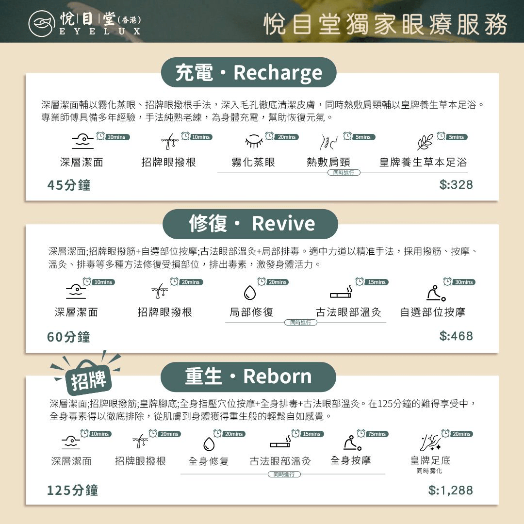悅目堂係唯一香港推出獨家眼療體驗,按摩店以天然草本配方和按摩手法,有助於延緩眼部老化、乾眼症等疾病。草本護眼精華經由霧化、艾灸、按摩等專業眼部護理程式,為眼睛補充營養,修復眼部疲勞,讓眼睛煥發光彩,為面部注入神采。