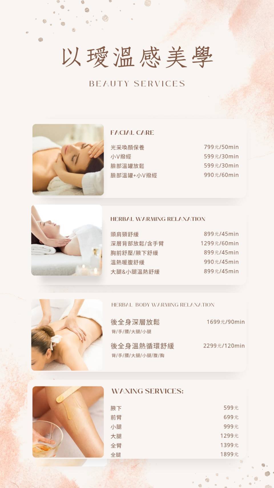 🌿以璦溫感美學・草本暖身溫罐·臉部撥經・熱蠟除毛 在城市的喧囂中,璦溫感美學是一處能讓身心慢下來的角落。 我們以溫熱的手感與靜謐氛圍,陪伴每一位前來的客人,卸下日常的疲憊,留下一份自在與安定。 這裡不只是療程的開始,更是一段專屬於您的療癒時光。