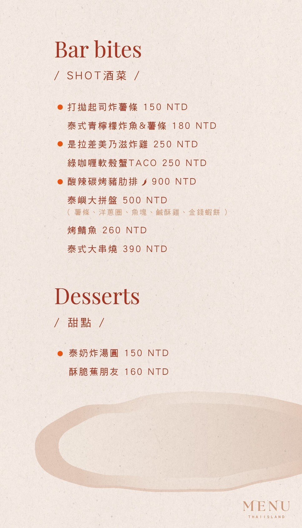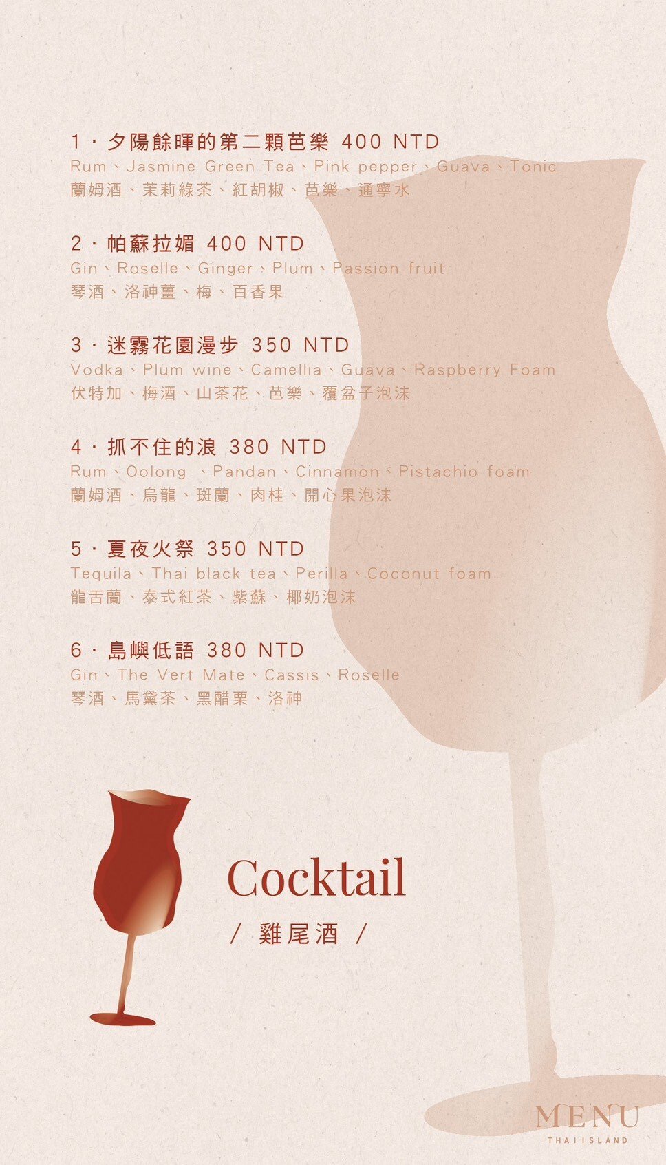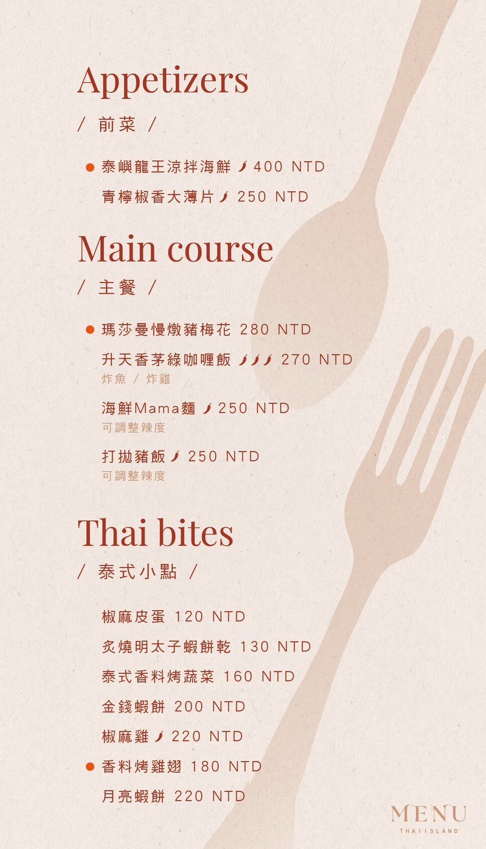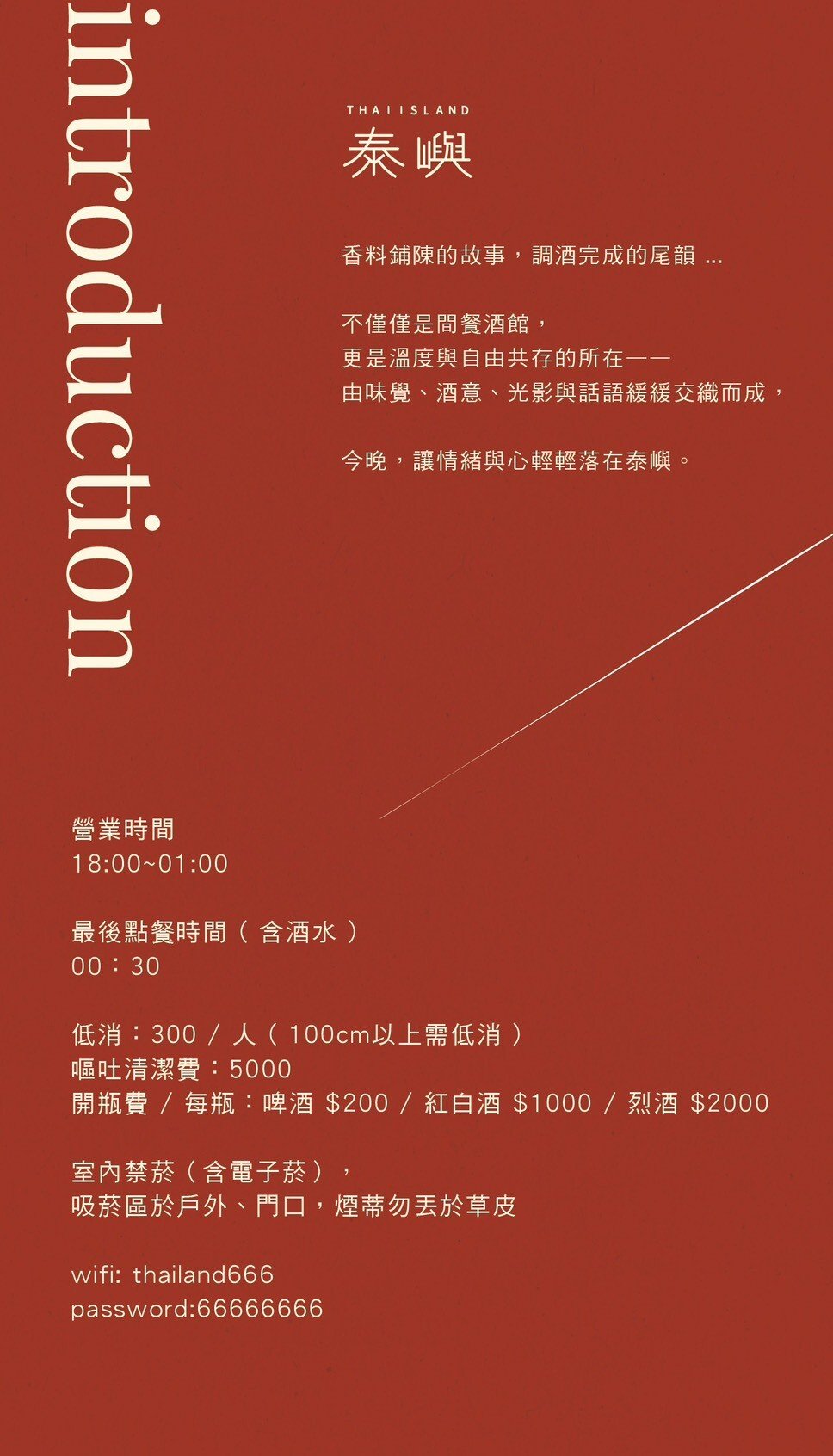🏝 泰嶼 Thai-Island 在泰嶼,我們以香料講述故事,以調酒延續情緒。 這裡不只是餐酒館,我們設計空間的溫度、提供自由的氛圍、販賣情緒的價值。 從經典泰式料理到創意微醺調酒,融合南洋色彩與都會質感,無論你帶著哪種情緒而來,都希望你能帶著放鬆與快樂回家。 泰嶼是適合聚會、約會、慶祝與自我沉澱的小島 每一口香料、每一杯酒,都是為你準備的情緒出口。