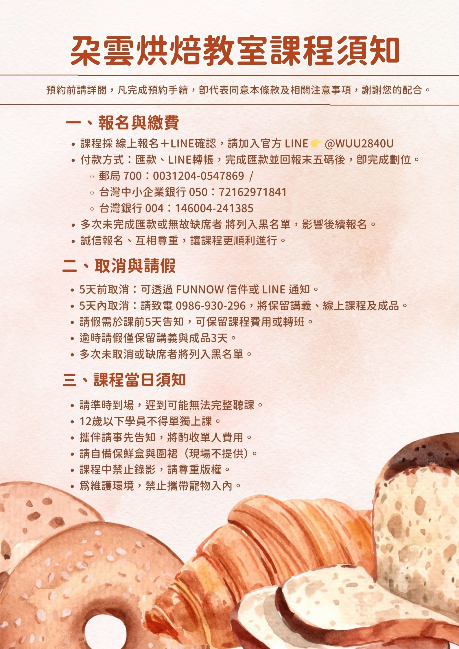 - 請假需於課前5天告知,可保留課程費用或轉班。