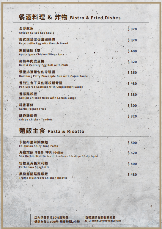 - 自帶酒水,需收開瓶費烈酒類每瓶 TWD 800、紅白氣泡酒每瓶 TWD 500。